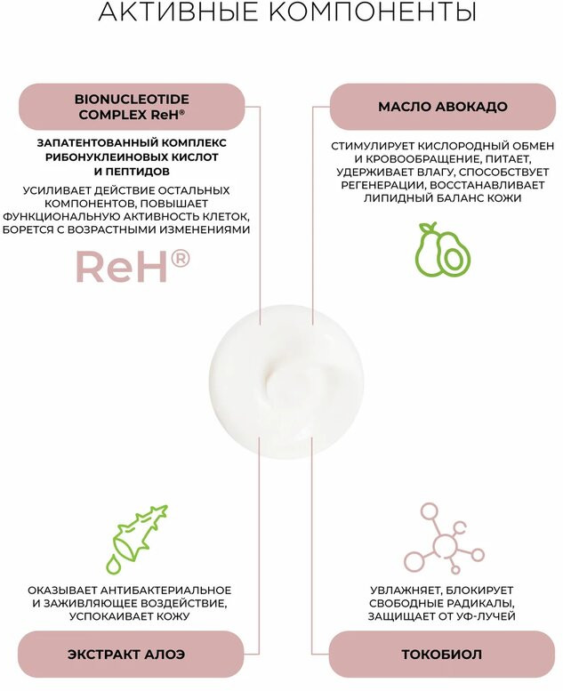 Антивозрастной крем премиальной линии Frau Sigrid с современными высокотехнологичными компонентами замедляет процессы увядания и корригирует видимые признаки старения кожи лица. Bionucleotide Complex ReH® — комплекс рибонуклеиновых кислот и пептидов в сочетании с высокоэффективными ингредиентами на растительной основе улучшает функциональную активность клеток и стимулирует естественную регенерацию клеток кожи, ускоряя ее обновление. Масла авокадо и рапса стимулируют кислородный обмен и кровообращение в коже, что благоприятно способствует выработке коллагена и эластина, делая кожу мягкой и увлажненной. Алоэ Вера гель оказывает антибактериальное, заживляющее, тонизирующее действие, удерживает в коже влагу и способствует ее регенерации. Сбалансированная формула ингредиентов обеспечивает максимальный омолаживающий и ревитализирующий эффект. Для нормальной и сухой кожи. Рекомендуется наносить после антивозрастной сыворотки Frau Sigrid ежедневно.