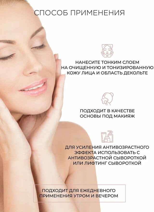 Способ применения: применять утром и вечером. Наносить на очищенную кожу. Для достижения максимального эффекта рекомендуется наносить после использования антивозрастной сыворотки.