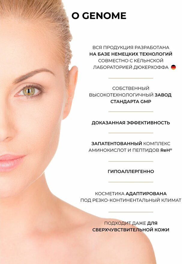 Нашим приоритетом является «Качество во всем» — состав, дизайн и сервис. Бренд известен уникальной формулой ReH® (комплекс рибонуклеиновых кислот и пептидов), разработанной совместными усилиями казахстанских и немецких учёных в 2013 году. Исследования «хромосом красоты» показали отличные результаты, поэтому GENOME стал набирать популярность и сегодня является достаточно известной маркой уходовой косметики. Благодаря особому сочетанию компонентов косметика оказывает...