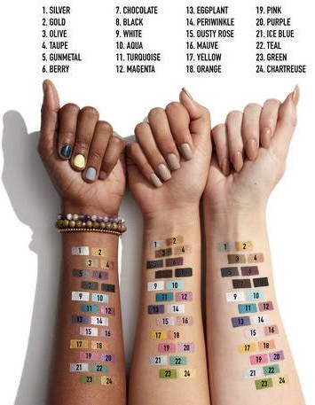 05 Gunmetal gaze18 Orange zest17 Cosmic yellow01 Silver lining34 Burnt sienna29 Black metal23 Emerald cut21 Chill blue11 Turquoise storm09 Pure white08 Pitch black04 Gilded taupe03 All-time olive19 Pink spirit12 Magenta shock20 Graphic purple13 Fierce purple22 Intense teal14 Periwinkle pop24 Chartreuse15 Frosted lilac30 Rose gold16 Dusty mauve02 Gold plated07 Deepest brown