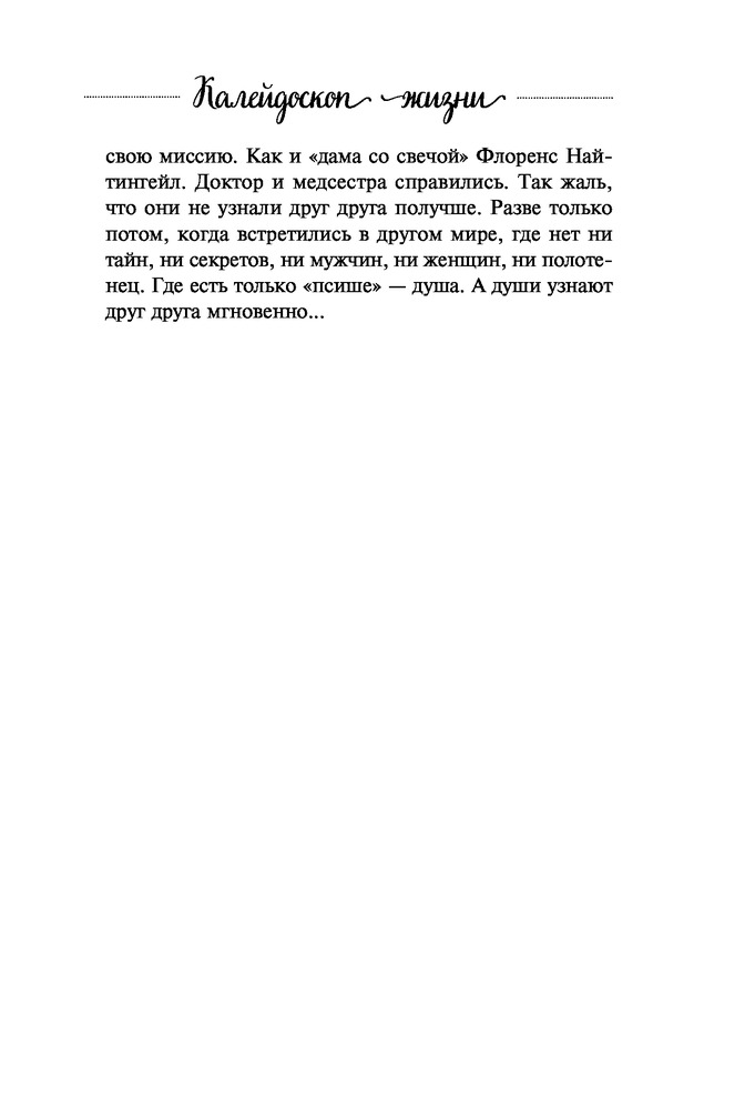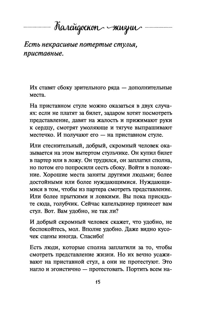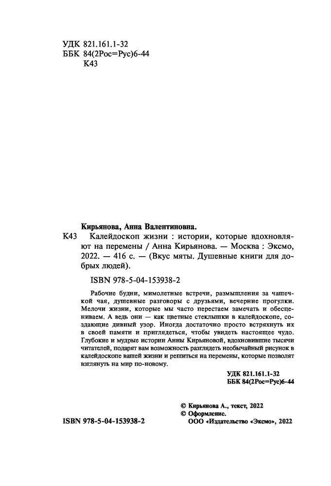 Калейдоскоп жизни. Истории, которые вдохновляют на переменыВ данный момент этот товар отсутствует в продаже. Возможно, у нас найдется аналогичный или похожий товар здесь. Серия: Вкус мяты. Душевные книги для добрых людей. Рабочие будни, мимолетные встречи, размышления за чашечкой чая, душевные разговоры с друзьями, вечерние прогулки. Мелочи жизни, которые мы часто перестаем замечать и обесцениваем. А ведь они — как цветные стеклышки в калейдоскопе, создающие дивный узор. Иногда достаточно просто встряхнуть их в своей памяти и приглядеться, чтобы увидеть настоящее чудо. |