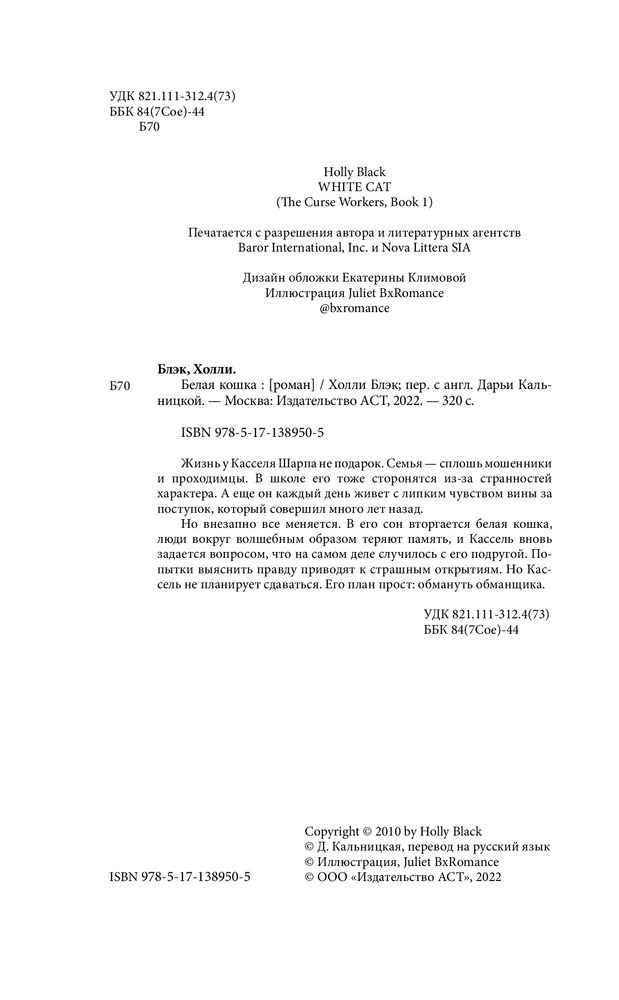 | Холли Блэк (Holly Black, урожденная Ридженбах) – американская писательница. Родилась в Нью-Джерси. Еще в школьные годы начала писать стихи, рассказы и пьесы. Окончив школу, вместе со своим другом и будущим мужем Тео Блэком отправилась в Нью-Джерси, где поступила в колледж. Окончив колледж Нью-Джерси со степенью бакалавра английской словесности, Холли решила получить вторую профессию и начала учиться библиотечному делу в школе при государственном университете Раджерс, подрабатывая... |