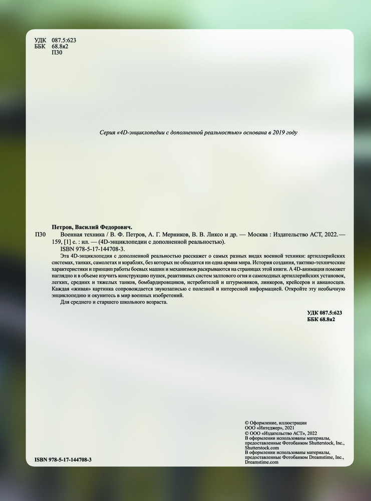 💳 Оплатить за товар можно при получении 🇰🇿 Есть бесплатная доставка по Казахстану 🎁 Копите бонусы с каждой покупки Серия: 4D энциклопедии с дополненной реальностью Эта 4D-энциклопедия с дополненной реальностью расскажет о самых разнообразных видах военной техники: артиллерийских системах, танках, самолетах и кораблях, без которых не обходится ни одна современная армия мира. История создания, характеристики и принцип работы боевых устройств и машин раскрываются на страницах этой книги. А 4D-анимации помогут наглядно и в объеме изучить конструкцию пушек, реактивных систем залпового огня и самоходных артиллерийских установок, легких, средних и тяжелых танков, бомбардировщиков, истребителей и штурмовиков, линкоров, крейсеров и авианосцев. Каждая «живая» картинка сопровождается звукозаписью с полезной и интересной информацией. Откройте эту необычную энциклопедию и окунитесь в мир военных изобретений. |