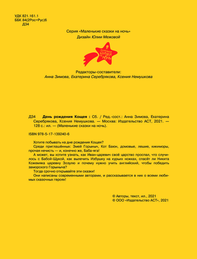 День рождения КощеяАнастасия Витальевна Безлюдная, Тимофей Бутенко В данный момент этот товар отсутствует в продаже. Возможно, у нас найдется аналогичный или похожий товар здесь. Серия: Маленькие сказки на ночь Хотите побывать на дне рождения Кощея? Среди приглашённых: Змей Горыныч, Кот Баюн, домовые, лешие, кикиморы, прочая нечисть — и, конечно же, Баба-яга! А может, вы хотите узнать, как Иван-царевич своё царство проспал, что случилось с Бабой-Щукой, как вылечить Избушку на курьих ножках, спасёт ли Никита Кожемяка царевну Зозулю и почему нужно учить английский, чтобы победить заморского Горыныча? |
