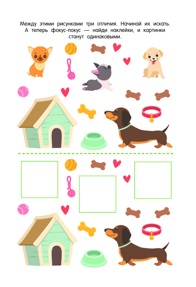 Серия: Найди отличия: книжка с наклейками Замечательная книжка «Домашние любимцы» порадует ребёнка и принесёт пользу, ведь поиск отличий — это одновременно и весёлая игра, и эффективная тренировка внимания, логики, зрительной памяти. На первый взгляд животные на картинках могут показаться одинаковыми, но на самом деле это не так. Чтобы найти все отличия, нужно присмотреться, внимательно изучить мелкие детали рисунка. Малыш с удовольствием дополнит странички стикерами, чтобы картинки стали одинаковыми, потренируется собирать пазлы-наклейки и своими руками создавать коллажи. |