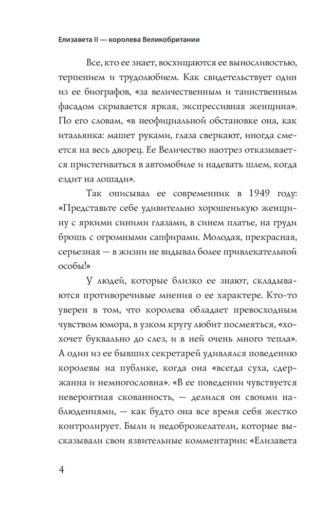 💳 Оплатить за товар можно при получении 🇰🇿 Есть бесплатная доставка по Казахстану 🎁 Копите бонусы с каждой покупки Серия: Биография эпохи Перед вами история жизни выдающейся женщины, которая вот уже более шестидесяти лет удивляет весь мир мудростью, решимостью, преданностью и, конечно, любовью, — к британскому народу,своей стране, своей семье. Елизавета II — не просто королева Великобритании, но человек — эпоха. Она стала не только свидетельницей, но и участницей многих значимых исторических событий современности. |