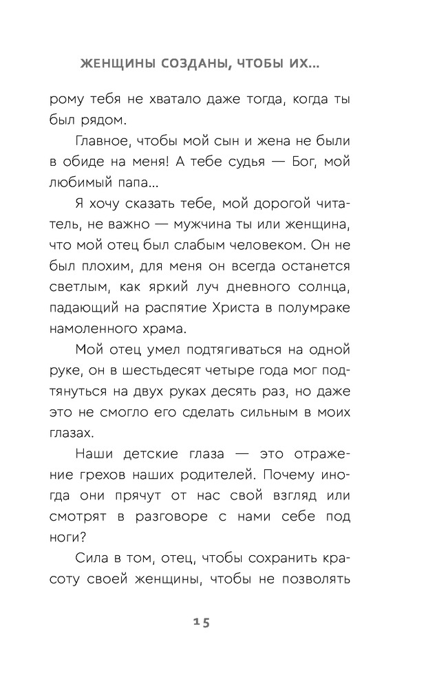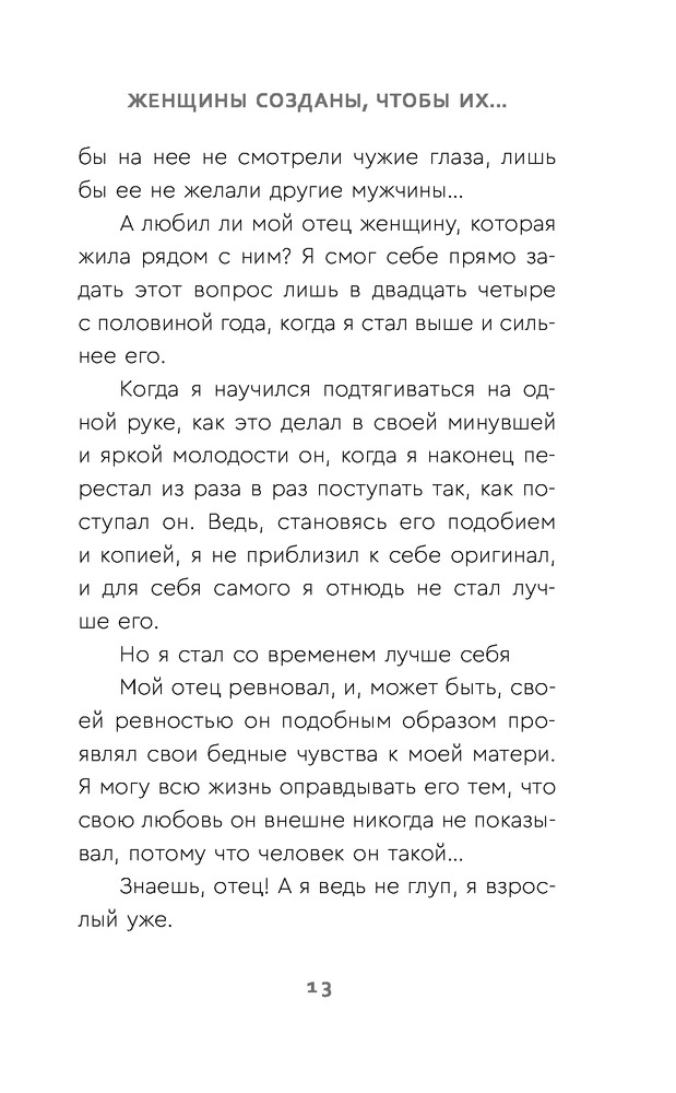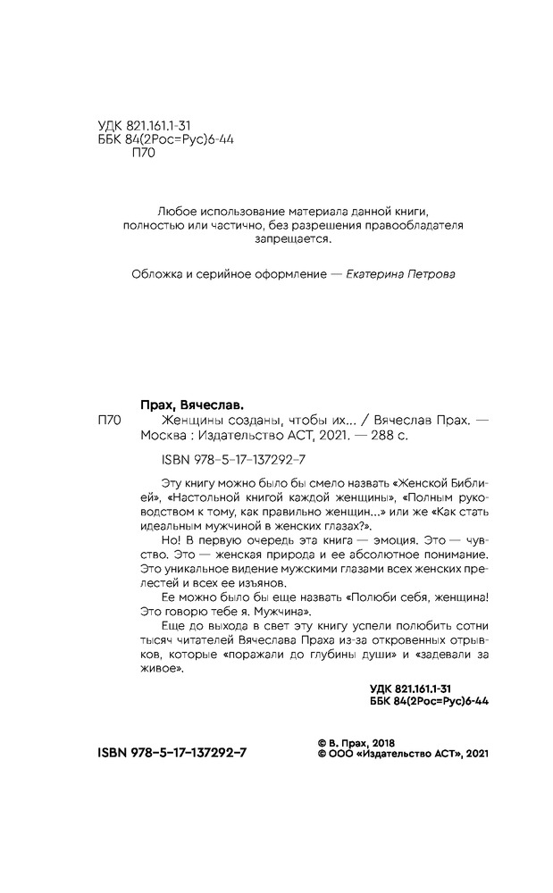 Женщины созданы, чтобы их...В данный момент этот товар отсутствует в продаже. Возможно, у нас найдется аналогичный или похожий товар здесь. Серия: Лирическая проза Вячеслава Праха Эту книгу можно было бы смело назвать «Женской Библией», «Настольной книгой каждой женщины», «Полным руководством к тому, как правильно женщин...» или же «Как стать идеальным мужчиной в женских глазах?». |