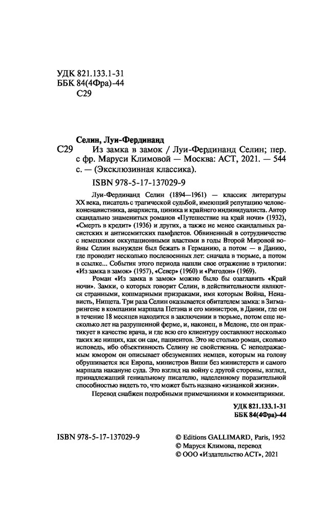 Роман «Из замка в замок» можно было бы озаглавить «Край ночи». Замки, о которых говорит Селин, в действительности являются странными, кошмарными призраками, имя которым Война, Ненависть, Нищета. Три раза Селин оказывается обитателем замка: в Зигмарингене в компании маршала Петэна и его министров, в Дании, где он в течение 18 месяцев находится в заключении в тюрьме, потом еще несколько лет на разрушенной ферме, и, наконец, в Медоне, где он практикует в качестве врача, и где всю его клиентуру составляют несколько таких же нищих, как он сам, пациентов. Это не столько роман, сколько исповедь, ибо объективность Селину не свойственна. С неподражаемым юмором он описывает обезумевших немцев, которым на голову обрушивается вся Европа, министров Виши без министерств и самого маршала накануне суда. Это взгляд на войну с другой стороны, взгляд, принадлежащий гениальному писателю, наделенному поразительной способностью видеть то, что может быть названо «изнанкой жизни». |