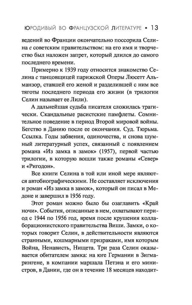 В данный момент этот товар отсутствует в продаже. Возможно, у нас найдется аналогичный или похожий товар здесь. Серия: Эксклюзивная классика Луи-Фердинанд Селин (1894-1961) — классик литературы XX века, писатель с трагической судьбой, имеющий репутацию человеконенавистника, анархиста, циника и крайнего индивидуалиста. Автор скандально знаменитых романов «Путешествие на край ночи» (1932), «Смерть в кредит» (1936) и других, а также не менее скандальных расистских и антисемитских памфлетов. Обвиненный в сотрудничестве с немецкими оккупационными властями в годы Второй Мировой войны Селин вынужден был бежать в Германию, а потом — в Данию, где проводит несколько послевоенных лет: сначала в тюрьме, а потом в ссылке... События этого периода нашли свое отражение в трилогии: «Из замка в замок» (1957), «Север» (1960) и «Ригодон» (1969).