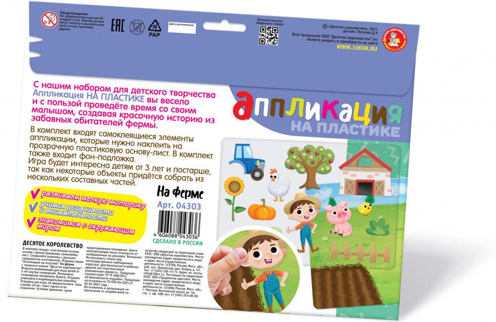 С набором для детского творчества вы весело и с пользой проведёте время со своим малышом, создавая красочную историю про весёлых обитателей фермы! |