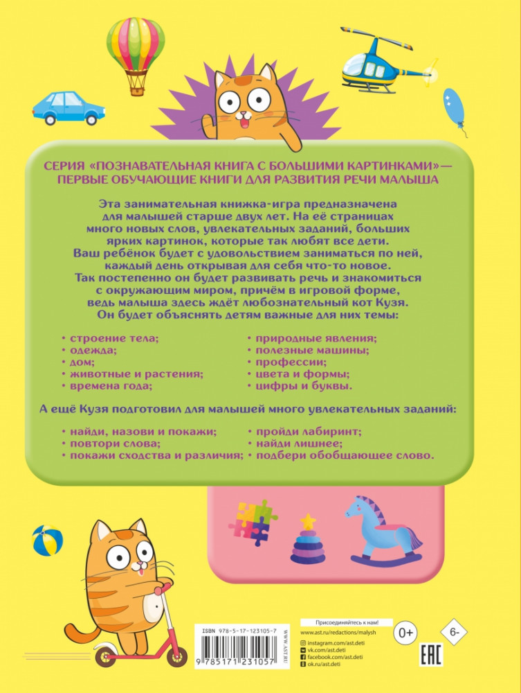 Серия: Познавательная книга с большими картинками Эта замечательная книга написана для малышей, которые только начинают познавать мир. Здесь представлены самые важные темы для детей этого возраста: тело человека и одежда, еда и напитки, дом и предметы в нём, профессии и виды спорта, цвета и формы, буквы и счёт, звукоподражание и вежливые слова, животные и растения, времена года и природные явления, транспорт и другие полезные машины. Каждая тема сопровождается большими яркими картинками, которые так любят рассматривать абсолютно все дети. И что интересно: на протяжении всего изучения книги малышей сопровождает любознательный кот Кузя. |