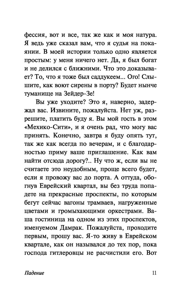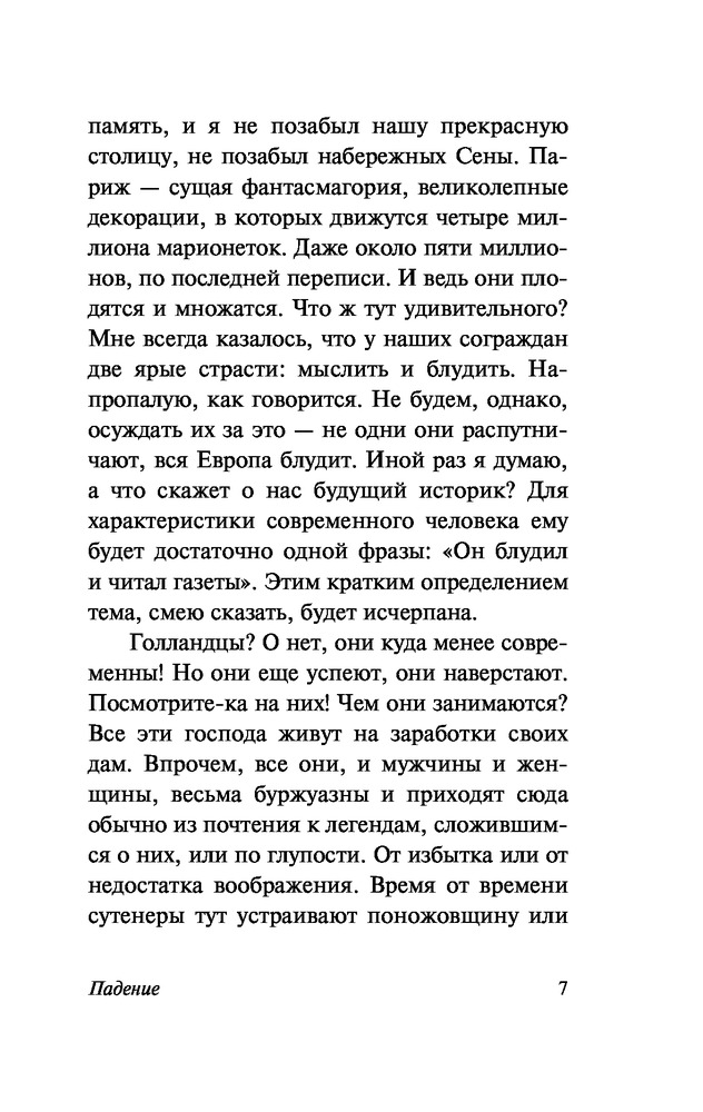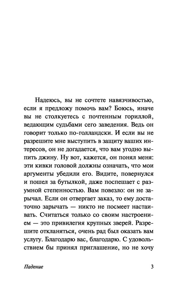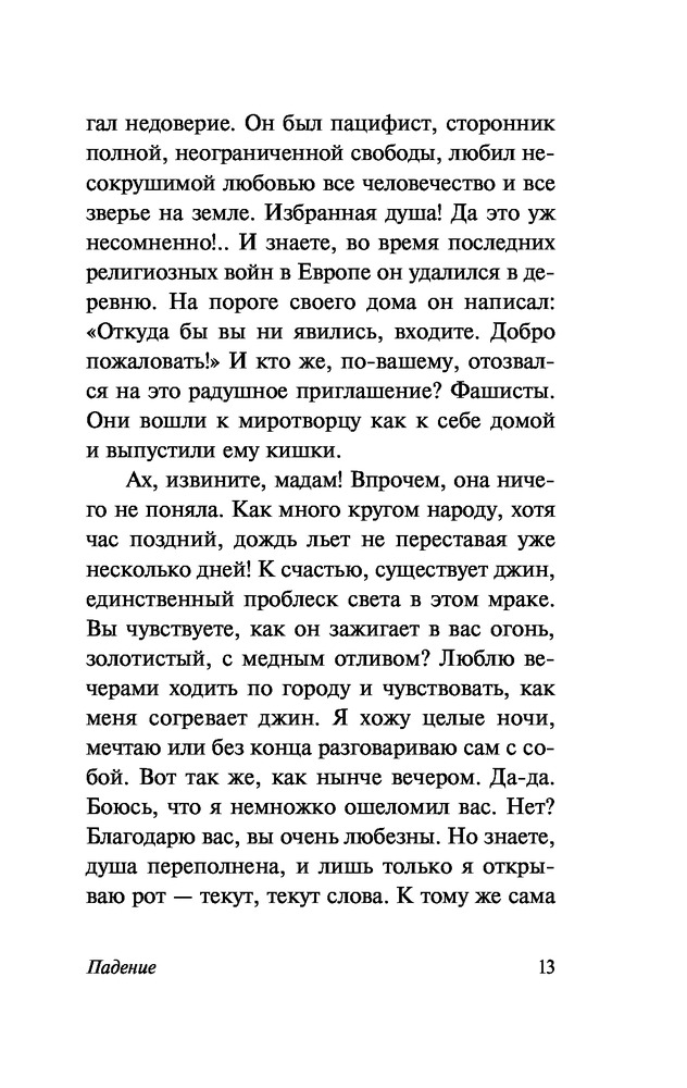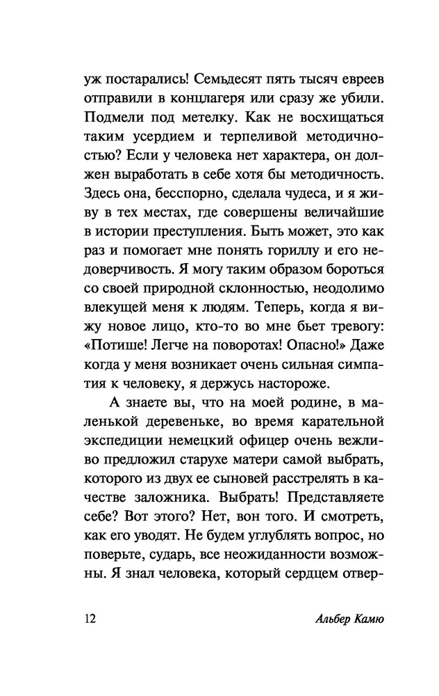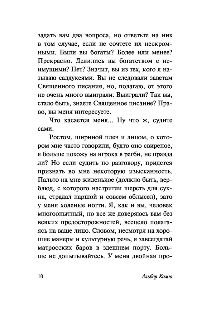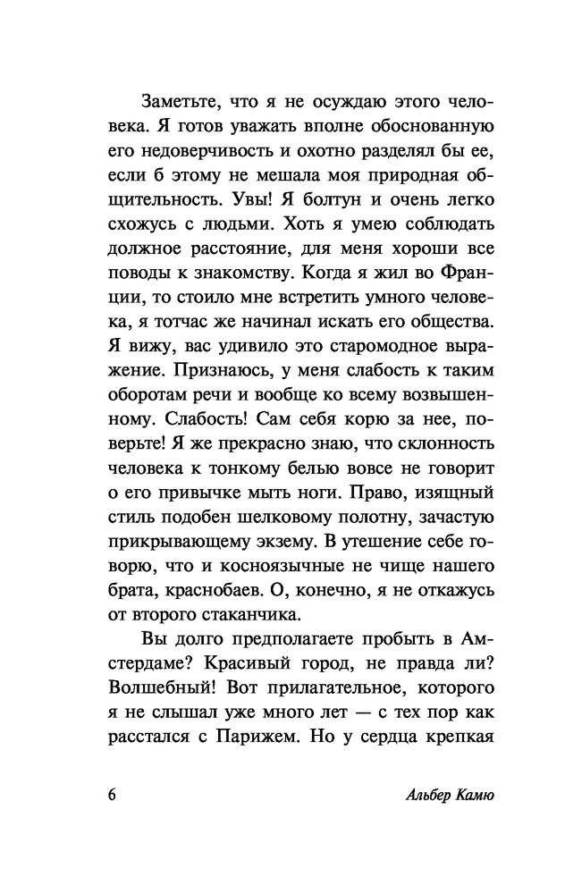 Книга включает в себя только одну повесть, написана она интересно и переведена хорошо, лично у меня никак вопросов по тому или иному моменту не возникало, как иногда бывает. Содержание интересно тем, что вся книга состоит из монолога главного героя с его новым знакомым. Очень интересно подбираться к ответу: "Почему именно такое название?" Несколько раз нас уводили в сторону, затягивая этот момент, чтобы накалить читателя, возбудить интерес. Единственный момент - отсутствие нумерации, при её наличии было бы удобнее понимать, где закончился предыдущий день и начался новый, но проблем особых с временными рамками не было, всё понятно. Следом, по техническому исполнению всё прекрасно: без каких-либо ошибок в тексте; без помарок при печати, страницы белые, умеренно толстые; обложка красивая, сделана хорошо, но при доставке обнаружил загнутый верхний правый край с лицевой стороны, мелочь, а неприятно, уходит дефект в глубь страниц на двадцать, но вины производителя в этом нет, тут подкачал кто-то, кто занимался либо упаковкой, либо доставкой. Напоследок, добавлю, что читается легко, занимает и поглощает разум целиком, герой заставляет читателя вступить с ним в заочный диалог, практически можно вступить в диалог с самим Альбером Камю, уверен, именно в таком ключе повесть и была задумана.