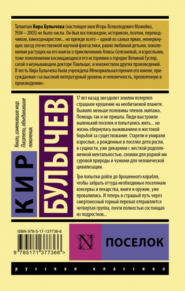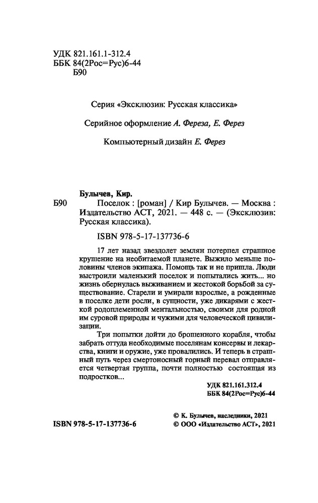 💳 Оплатить за товар можно при получении 🇰🇿 Есть бесплатная доставка по Казахстану 🎁 Копите бонусы с каждой покупки Серия: Эксклюзив: Русская классика 17 лет назад звездолет землян потерпел страшное крушение на необитаемой планете. Выжило меньше половины членов экипажа. Помощь так и не пришла. Люди выстроили маленький Поселок и попытались жить... но жизнь обернулась выживанием и жестокой борьбой за существование. Старели и умирали взрослые, а рожденные в поселке дети росли, в сущности, уже дикарями с жесткой родоплеменной ментальностью, своими для родной им суровой природы и чужими для человеческой цивилизации. |