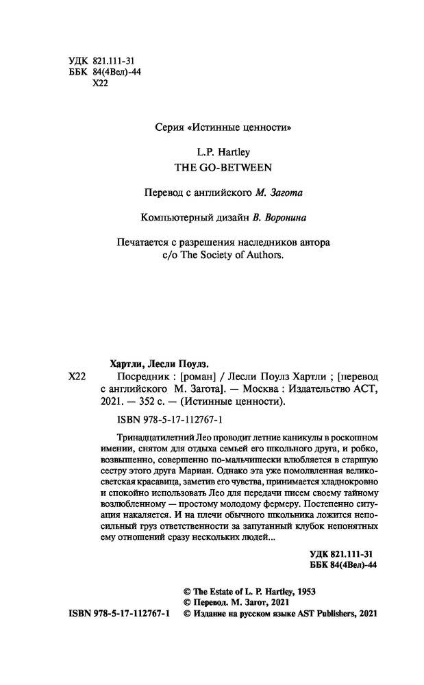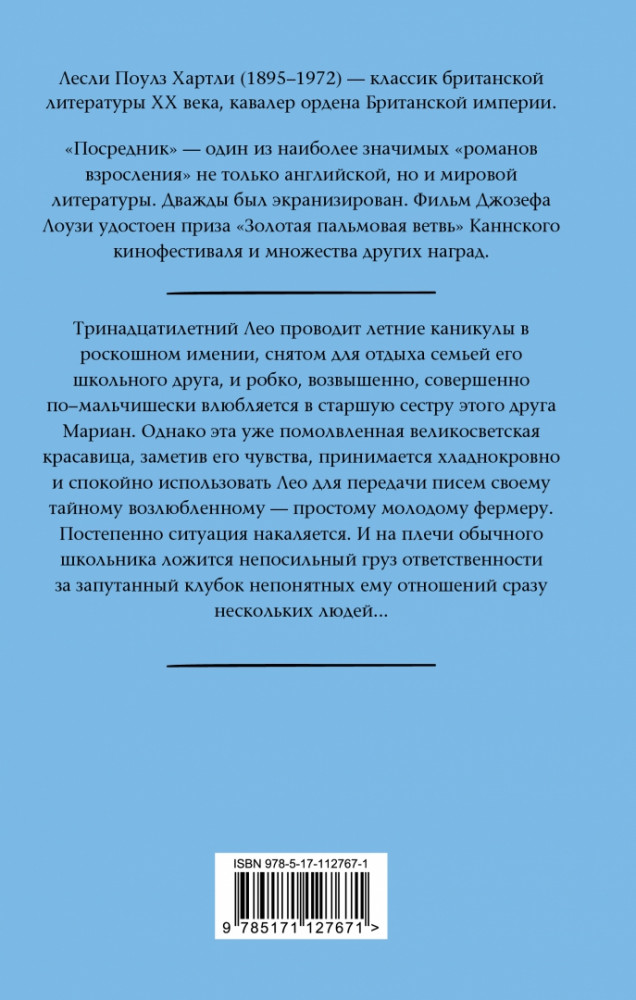 ПосредникВ данный момент этот товар отсутствует в продаже. Возможно, у нас найдется аналогичный или похожий товар здесь. Серия: Истинные ценности Лесли Поулз Хартли — классик английской литературы, его произведения неоднократно экранизированы. Тринадцатилетний Лео проводит летние каникулы в роскошном имении, снятом для отдыха семьей его школьного друга, и робко, возвышенно, совершенно по-мальчишески влюбляется в старшую сестру этого друга Мариан. |