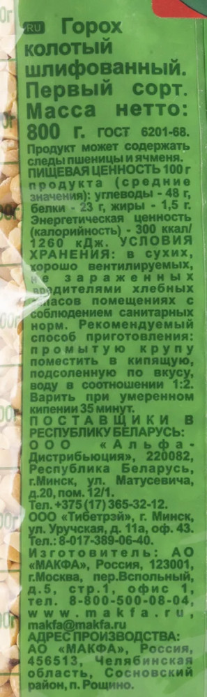 Makfa Горох шлифованный колотыйбыстро варится чистый без замачивания вкусный для супа