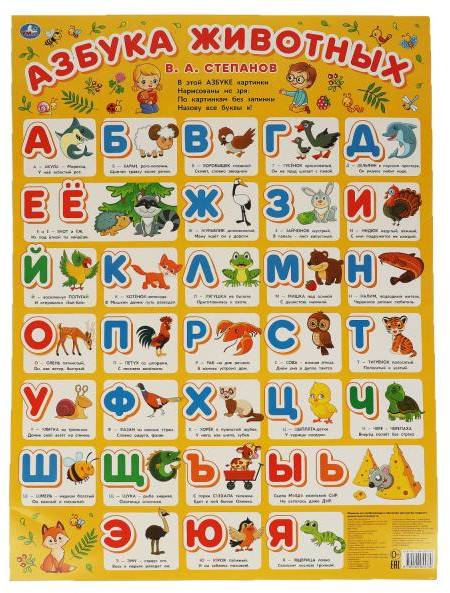 УМка Азбука животных. ПлакатВ данный момент этот товар отсутствует в продаже. Возможно, у нас найдется аналогичный или похожий товар здесь. Данный плакат станет отличным помощником для дошкольников в процессе получения ими новых знаний. Плакат можно повесить на стену, чтобы он всегда был на виду: визуальная информация запоминается детьми в разы быстрее и легче, они без труда выучат азбуку, а интересные стихи на каждую букву им также в этом помогут. |