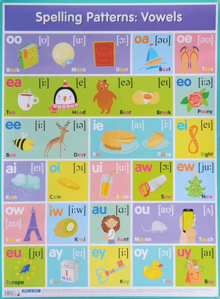 Серия: Наглядные пособия. Плакаты Пособие «Буквосочетания. Гласные» наглядно иллюстрирует произношение наиболее распространенных буквосочетаний с гласными буквами английского языка. На плакате представлена таблица с буквосочетаниями, транскрипцией звуков, а также примерами слов. Материал структурирован так, чтобы облегчить запоминание английской фонетики, помочь ребенку «отработать» каждый звук и закрепить правильное произношение. |