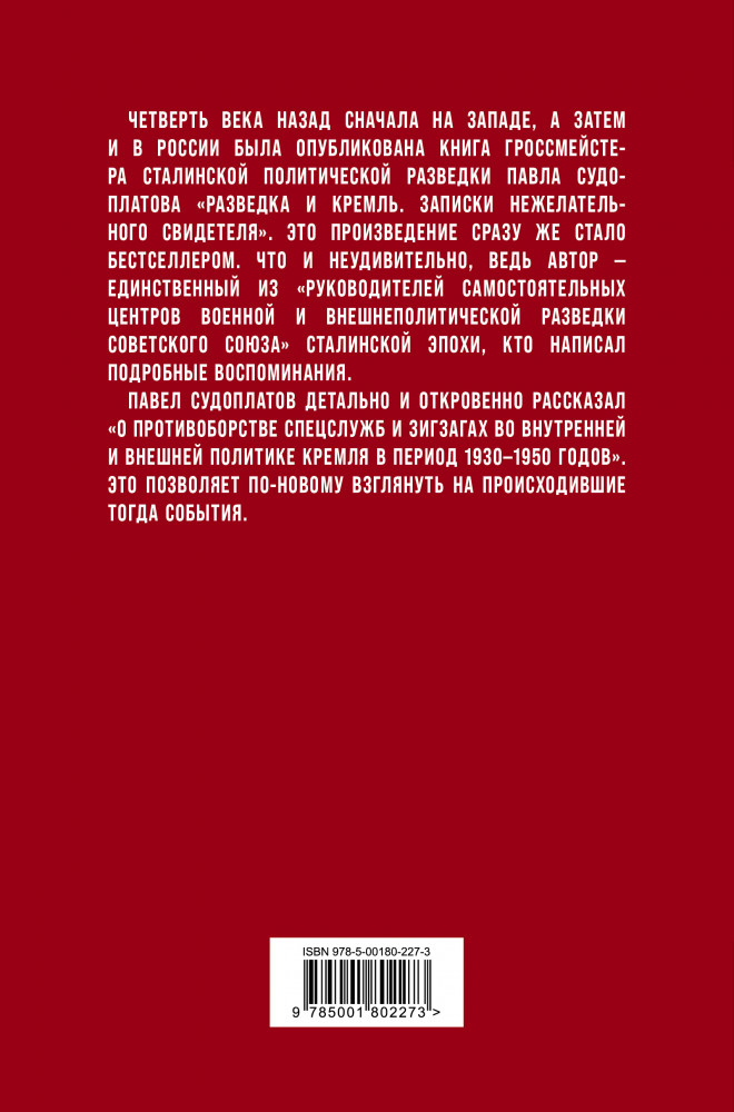 Серия: Книга-эпоха Четверть века назад, сначала на Западе, а затем и в России была опубликована книга гроссмейстера сталинской политической разведки Павла Судоплатова «Разведка и Кремль. Записки нежелательного свидетеля». Это произведение сразу же стала бестселлером. Что и не удивительно, ведь автор — единственный из «руководителей самостоятельных центров военной и внешнеполитической разведки Советского Союза» сталинской эпохи, кто написал подробные воспоминая. |