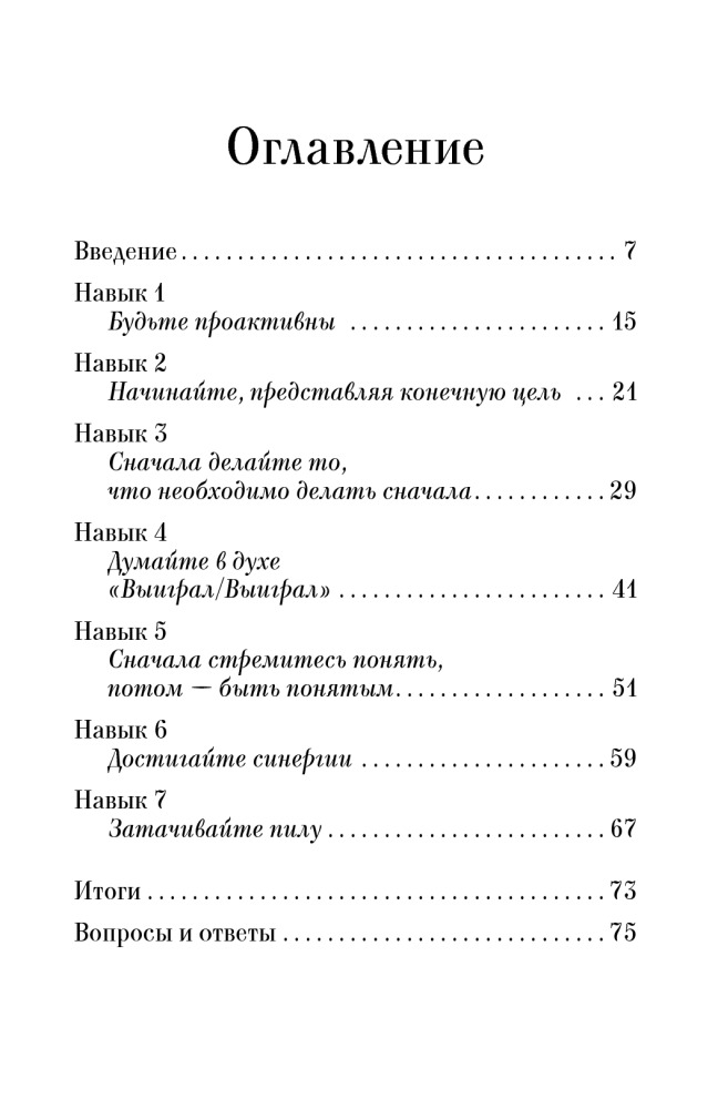 Разочарована этой книгой. Цена не равносильна размеру книги и той информации которую несет. Я была под большим впечатлением от книги Семь навыков высокоэффективных людей и ожидала получить положительные эмоции и навыки от этой книги, но увы. Прочитала за 30 минут. Ничего нового не открыла. Не советую ее тем кто знаком с первой его книгой. Да и для новичков этого автора тоже не советую, лучше доплатить и купить Семь навыков высокоэффективных людей и получить массу полезной информации.