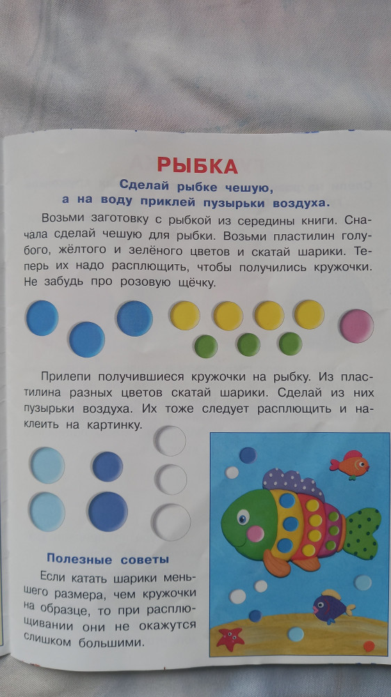 Лепка из пластилина — это отличный способ тренировки мелкой моторики у ребёнка. Книги этой серии предназначены для развития начальных навыков лепки из пластилина: катание шариков и их расплющивание, формирование колбасок и работа со стеком. В книге «Рыбка» четыре заготовки, которые ребёнок может доделать сам, чтобы получить законченную картинку. Сделай рыбке чешую и приклей пузырики воздуха на воду. Желаем удачи в творчестве! |