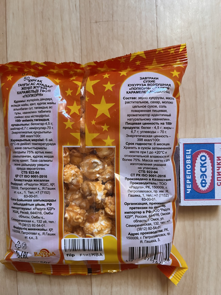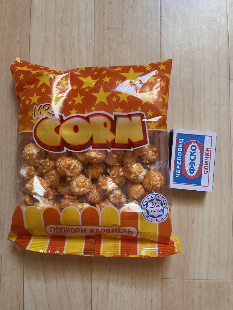 Зерно кукурузы, масло растительное, сахар, молоко цельное сухое, соль поваренная пищевая, ароматизатор идентичный натуральному карамель, сахар.