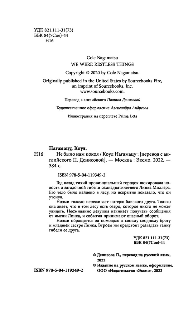 Не было нам покояВ данный момент этот товар отсутствует в продаже. Возможно, у нас найдется аналогичный или похожий товар здесь. Серия: Young Adult. Дожить до рассвета. Триллеры «Не было нам покоя» — необычный мистический триллер Коул Нагамацу. Это история о том, как загадочная смерть подростка меняет жизни трех его друзей. Волшебная, мудрая и трогательная книга, которая рассказывает, как общество формирует нашу реальность, как мы можем научиться любить себя и других людей и какая невероятная сила содержится в наших желаниях. Год назад тихий провинциальный городок шокировала новость о загадочной гибели семнадцатилетнего Линка Миллера. Его тело было найдено в лесу, но вскрытие показало, что он утонул.Ноэми тяжело переживает потерю близкого друга. Только она знает, что в том лесу есть озеро, которое никто не может увидеть. Неожиданно девушка начинает получать сообщения от имени Линка, и события принимают опасный оборот.Ноэми обращается за помощью к своему сводному брату и младшей сестре Линка. Втроем им предстоит разгадать тайну гибели ее друга. |