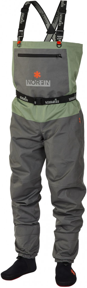Забродный полукомбинезон изготовлен из высококачественного четырехслойного «дышащего» мембранного материала. Минимальное количество швов, удобный крой, идеальный баланс между прочностью, водонепроницаемостью и «дышащими» свойствами. Носки изготовлены из плотного износостойкого неопрена, толщиной 5 мм.