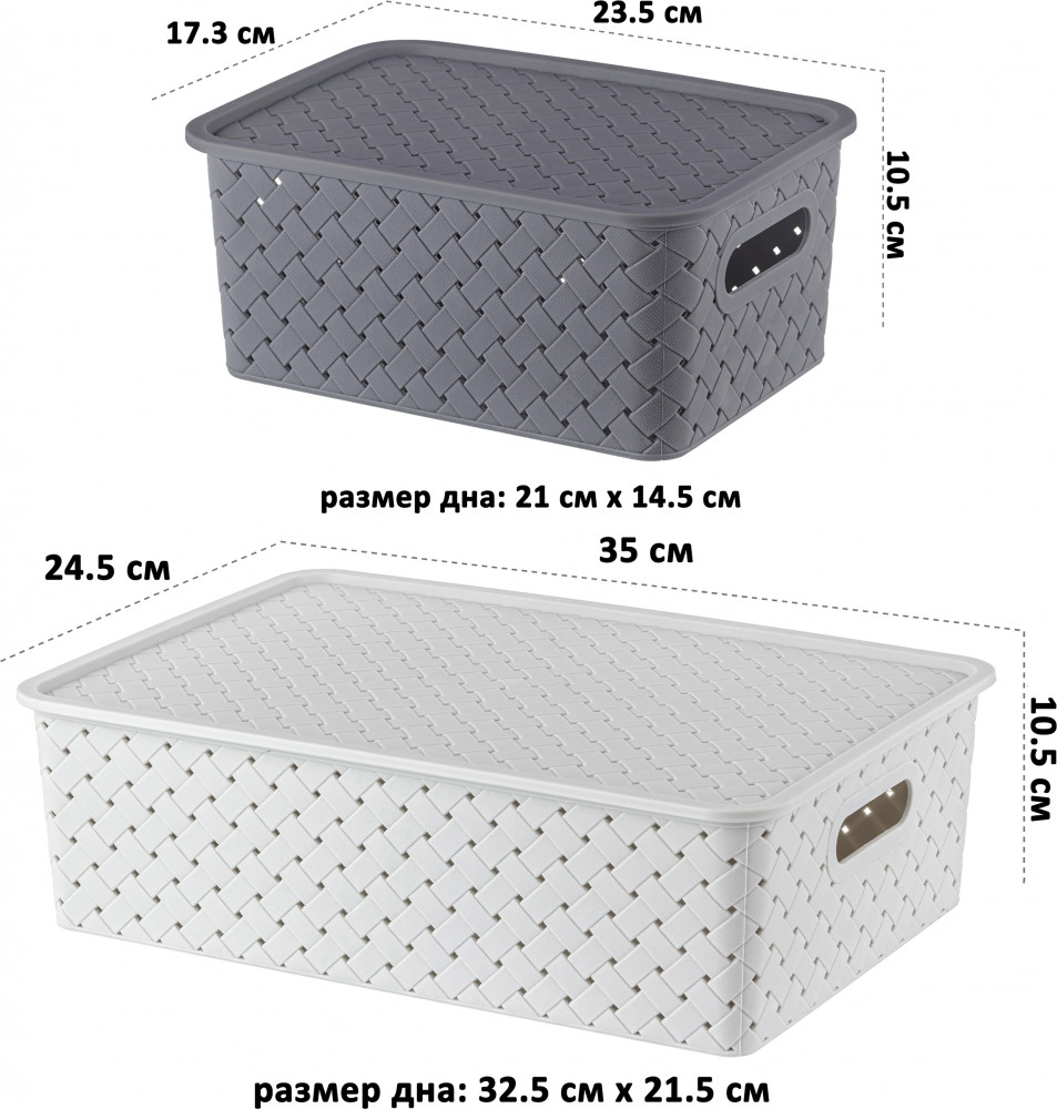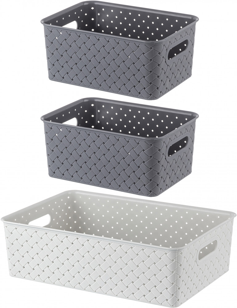 Набор из 3-х корзин с ручками и крышками (7,5 литра, 3 литра) можно разместить на кухне, в ванной, прихожей, офисе, гараже или в шкафу. Большие коробки подойдут для бытовой химии, игрушек, одежды (для шапок, перчаток, белья, носков), а маленькие корзинки — для канцелярии, косметики, украшений, рукоделия (для пряжи, вязания) и других мелочей. Контейнеры 7,5 литра подойдут для документов и бумаги А4. Корзины выполнены из пищевого полипропилена и украшены декоративными рельефными узорами с отверстиями для вентиляции. Полностью безопасны и подходят для продуктов. Используйте их для овощей, как хлебницы или как фруктовые корзинки. Можно использовать как подарочные боксы: собрать наборы для мужчин и женщин, девушек и парней, мальчиков и девочек. Пластиковые корзины из серии «Береста» привлекательно выглядят и помогут создать систему для хранения вещей в едином стиле или гардеробную систему в вашей прихожей!
