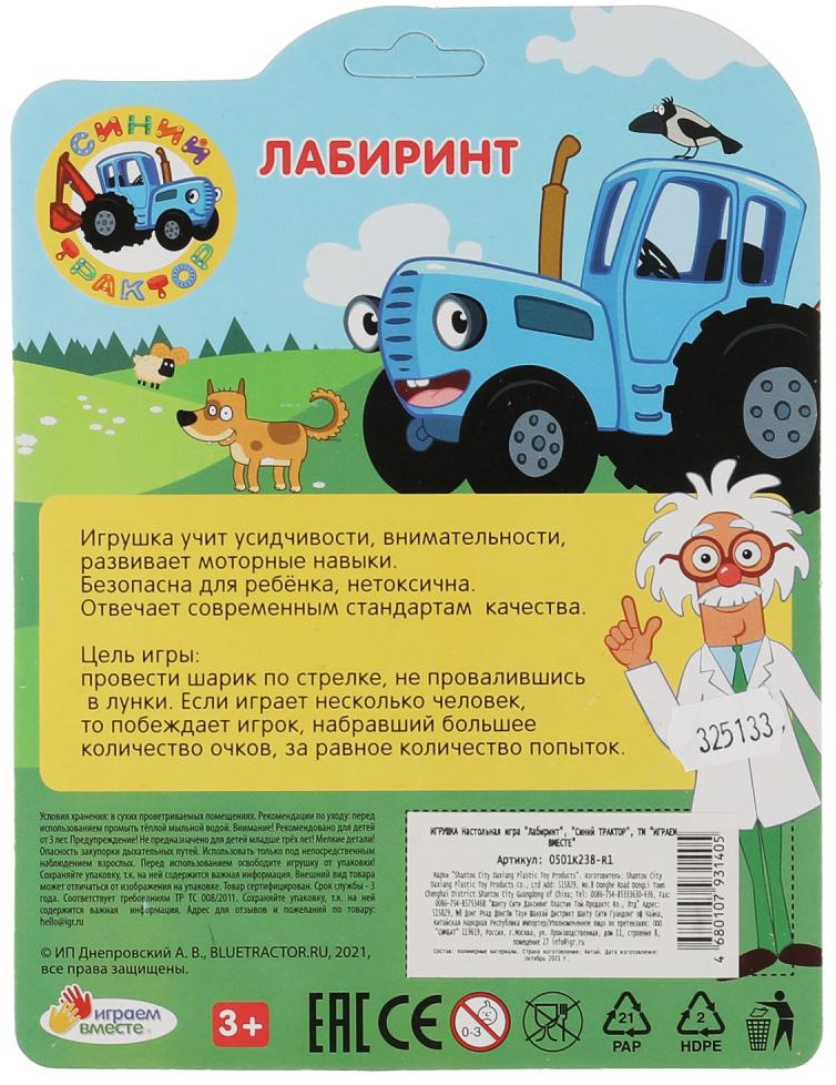 Серия: Синий трактор Задача ребёнка — провести шарик по стрелке-дорожки, мимо множества лунок, чтобы пройти лабиринт можно наклонять поле в разные стороны. Если шарик провалится в лунку, придётся начинать игру сначала. Благодаря компактным размерам игрушку удобно носить с собой. |