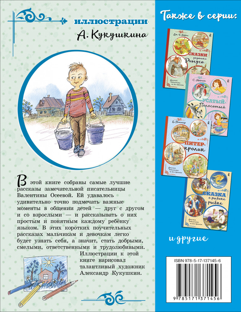 Синие листья. РассказыВалентина Александровна Осеева В данный момент этот товар отсутствует в продаже. Возможно, у нас найдется аналогичный или похожий товар здесь. Серия: Детская библиотека на все времена В этой книге собраны самые лучшие рассказы замечательной писательницы Валентины Осеевой. Ей удавалось удивительно точно подмечать важные моменты в общении детей — друг с другом и со взрослыми — и рассказывать о них простым и понятным каждому ребёнку языком. В этих коротких поучительных рассказах мальчикам и девочкам легко будет узнать себя, а значит, стать добрыми, смелыми, ответственными и трудолюбивыми. Иллюстрации к этой книге нарисовал талантливый художник Александр Кукушкин. |
