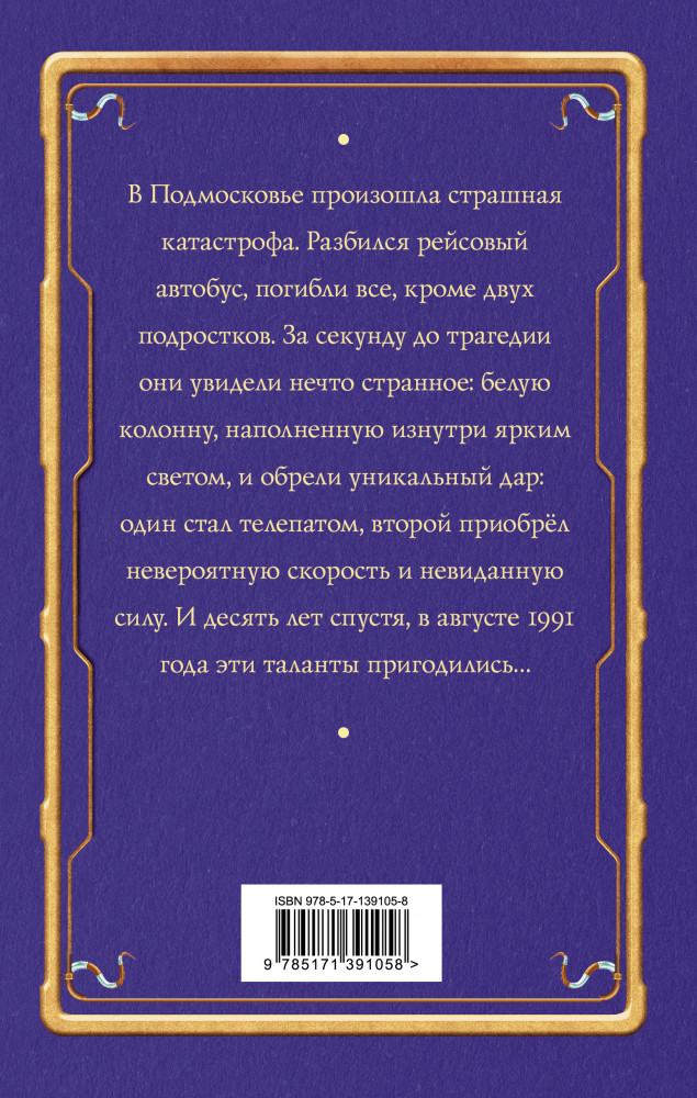 ФантастикаВ данный момент этот товар отсутствует в продаже. Возможно, у нас найдется аналогичный или похожий товар здесь. Серия: Новые жанры Бориса Акунина В Подмосковье произошла страшная катастрофа. Разбился рейсовый автобус, погибли все, кроме двух подростков. За секунду до трагедии они увидели нечто странное: белую колонну, наполненную изнутри ярким светом, и обрели уникальный дар: один стал телепатом, второй приобрёл невероятную скорость и невиданную силу. И десять лет спустя, в августе 1991 года эти таланты пригодились... |