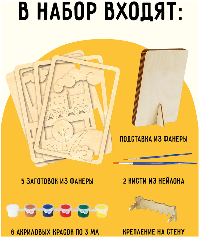 Набор для творчества — это комплект деревянных заготовок для раскрашивания и склеивания. На деревянные заготовки нанесен рисунок-контур для раскрашивания. Каждая заготовка раскрашивается отдельно, просушивается и склеивается в красивое 3D панно.