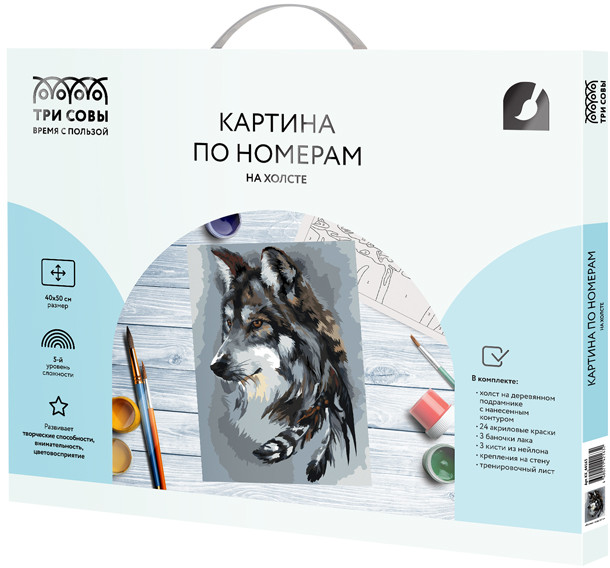 • холст на деревянном подрамнике 40×50 с нанесенным контуром, пронумерованный в соответствии с номерами красок. Контур под раскрашивание нанесен в том числе и на торцы подрамника, что позволяет разместить готовую работу на стене не обрамляя в багет или раму. Технология точной разбивки сюжета картины на разные цветовые оттенки гарантируют правильность исполнения полотна;