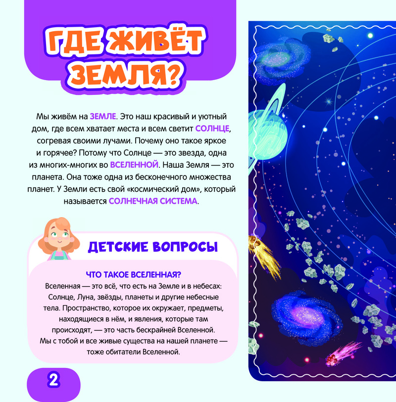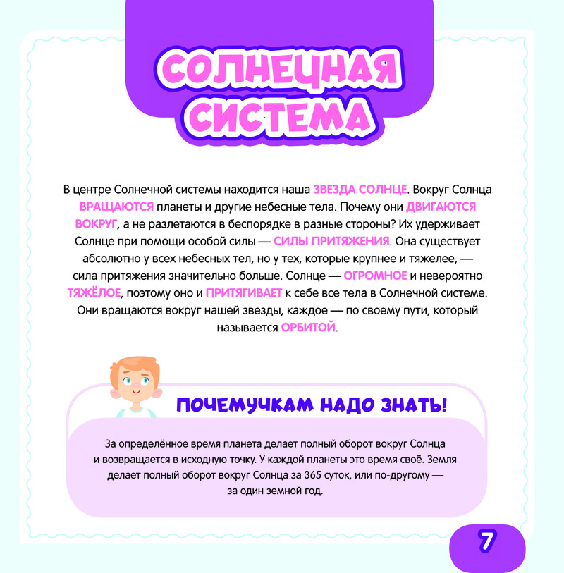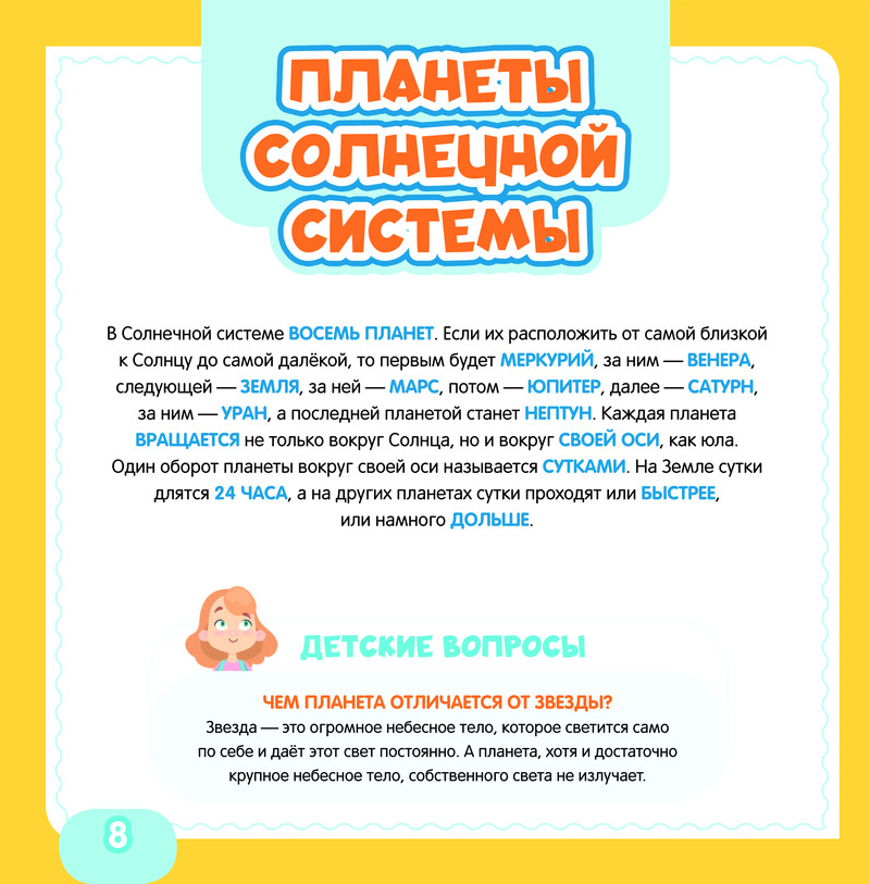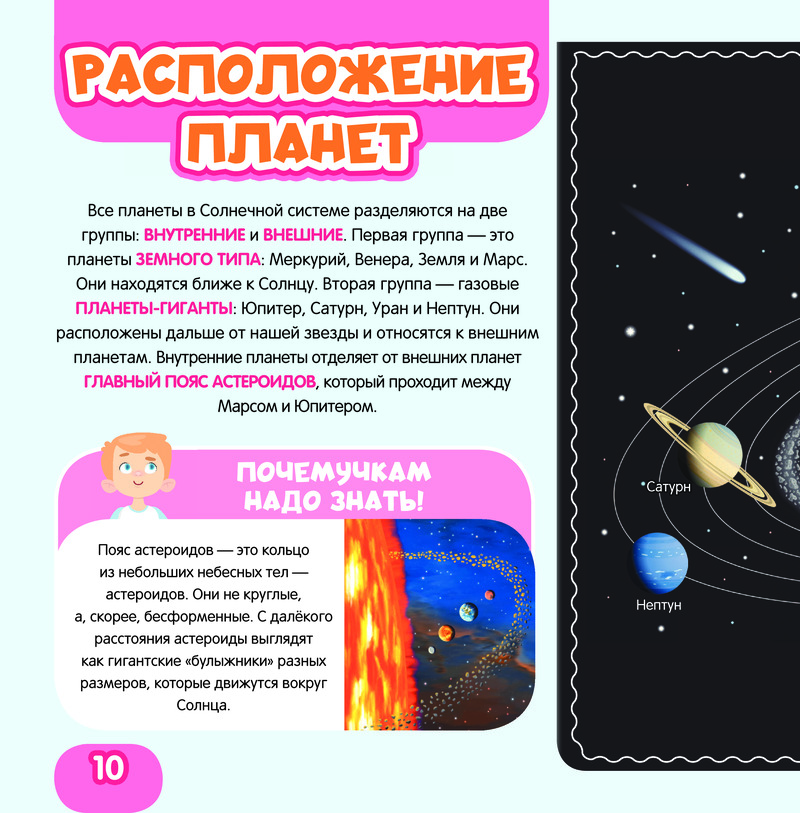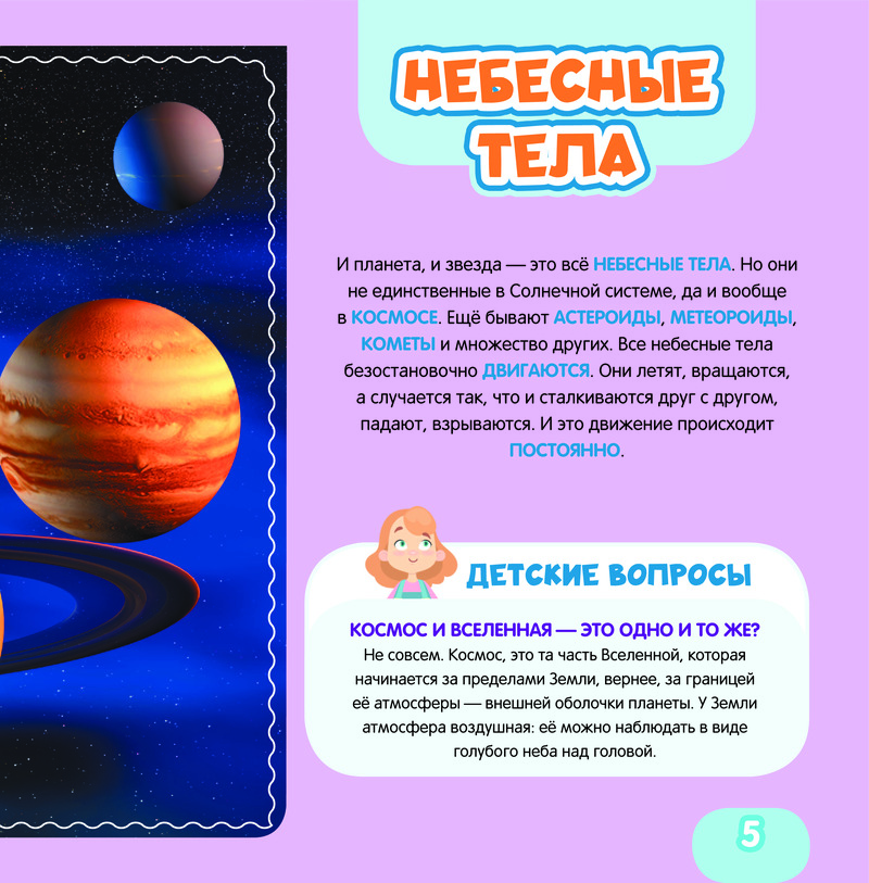 Серия: Удивительная книга с дополненной реальностью Вы держите в руках уникальное иллюстрированное издание «Моя первая книга о планетах», которое сможет не только рассказать, но и показать вашему малышу, как устроены Солнце и Солнечная система, планеты и их спутники, из чего состоят астероиды, метеороиды и кометы. Простым и доступным языком в книге объясняется, что такое Вселенная и космос, орбита и сила притяжения. Ваш почемучка получит ответы на множество вопросов: например, чем метеор отличается от метеорита, а Луна — от месяца? Почему Солнце на небе большое, а остальные звёзды — маленькие? Знакомство с космосом и небесными телами в издании сопровождается дополненной реальностью. Достаточно навести на страницу гаджет — и картинки на ней оживут: вокруг Солнца в космическом «хороводе» завертятся планеты и пролетят астероиды, а оно выбросит в пространство причудливые огненные петли протуберанцев. «Властелин колец» Сатурн предстанет в окружении многочисленных спутников, марсоход проедется по красным пескам Марса и солнечные лучи озарят из космоса нашу «голубую жемчужину» Землю. Каждая «живая» картинка сопровождается кратким рассказом о том, какие «достопримечательности» находятся на поверхности разных небесных тел и как их изучают? Откройте вместе с ребёнком эту необычную книгу и окунитесь в таинственный и манящий мир далёких планет и бескрайних космических просторов. Для дошкольного возраста. |