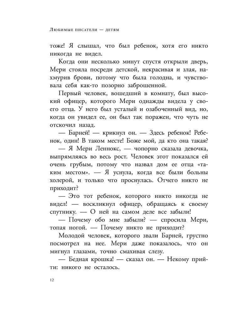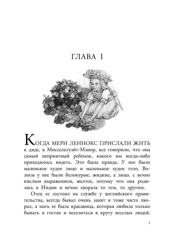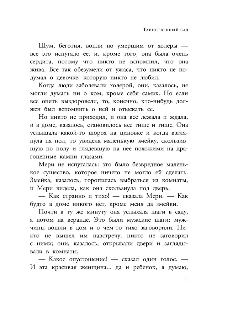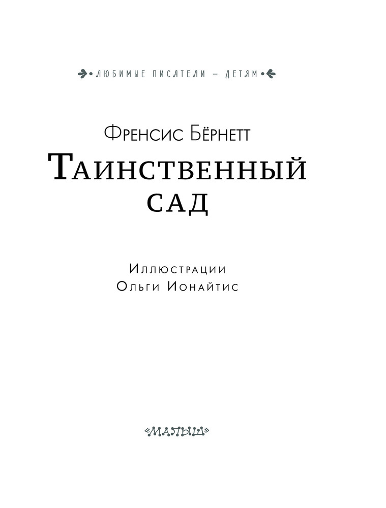 Серия: Любимые писатели — детям «Таинственный сад» (англ. The Secret Garden) — роман англо-американской писательницы Фрэнсис Элизы Бёрнетт. Полностью был впервые опубликован в 1911 году. «Таинственный сад» является одной из самых популярных книг у писательницы. В старинном поместье, куда привезли Мери Леннокс, есть сад, в который никому нельзя заходить. Эта тайна притягивает угрюмую и очень одинокую девочку... И таинственный сад постепенно открывает ей свои секреты. Мери постигает простую истину: чтобы тебя любили, нужно заботиться о ком-то и любить самой. Перевела с английского Розалия Рубинова. По книге «Таинственный сад» было снять пять фильмов, четыре сериала, мультфильм, два мюзикла и даже опера. Книга вдохновила самых разных художников во всём мире на создание своего «таинственного сада». Иллюстрации Ольги Ионайтис полностью погрузят читателя в атмосферу конца XIX — начала XX вв., а также абсолютно очаровательный таинственный сад. Для среднего школьного возраста. |