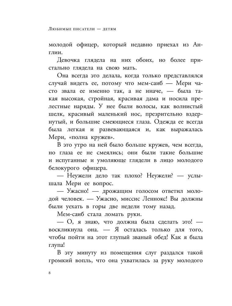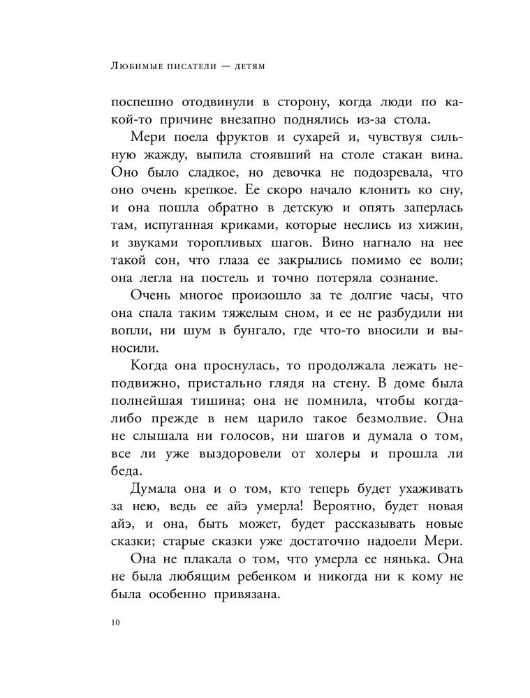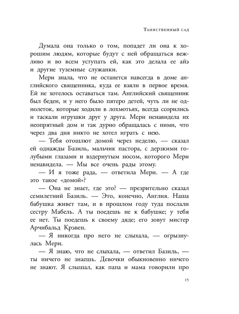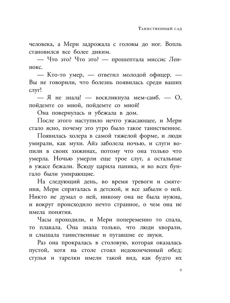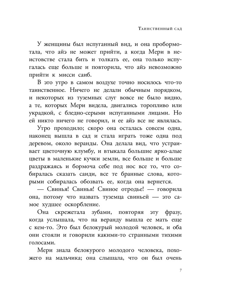 Серия: Любимые писатели — детям «Таинственный сад» (англ. The Secret Garden) — роман англо-американской писательницы Фрэнсис Элизы Бёрнетт. Полностью был впервые опубликован в 1911 году. «Таинственный сад» является одной из самых популярных книг у писательницы. В старинном поместье, куда привезли Мери Леннокс, есть сад, в который никому нельзя заходить. Эта тайна притягивает угрюмую и очень одинокую девочку... И таинственный сад постепенно открывает ей свои секреты. Мери постигает простую истину: чтобы тебя любили, нужно заботиться о ком-то и любить самой. Перевела с английского Розалия Рубинова. По книге «Таинственный сад» было снять пять фильмов, четыре сериала, мультфильм, два мюзикла и даже опера. Книга вдохновила самых разных художников во всём мире на создание своего «таинственного сада». Иллюстрации Ольги Ионайтис полностью погрузят читателя в атмосферу конца XIX — начала XX вв., а также абсолютно очаровательный таинственный сад. Для среднего школьного возраста. |