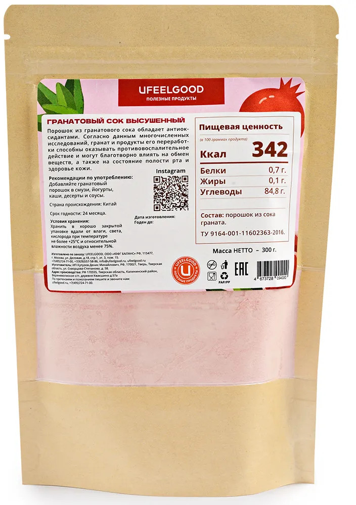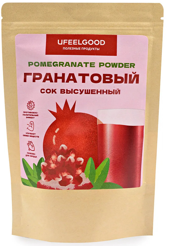 Сок гранатовый высушенный Ufeelgood. Согласно данным многочисленных исследований, гранат и продукты его переработки способны оказывать противовоспалительное действие и могут благотворно влиять на обмен веществ, а также на состояние полости рта и здоровье кожи. Порошок их гранатового сока обладает антиоксидантами.