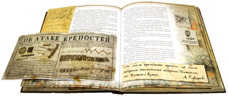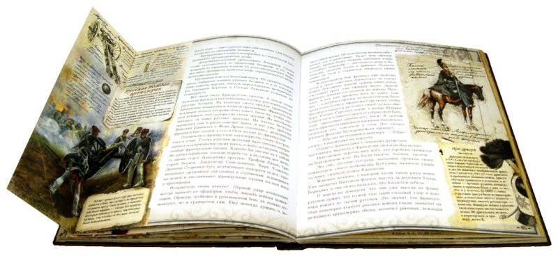 Книга очень хороша по оформлению и, надеюсь, по содержанию (я только в процессе чтения). По оформлению аналогично "Острову сокровищ" и "Алисе в стране чудес" от Лабиринта - масса занимательных заметок на полях, клапаны, карты сражений, окошки, конверты и прочее))) Читается легко и увлекательно - это настоящее художественное произведение, а не энциклопедия:)) При этом по этой книге можно подробно (о, как подробно!) изучать Великую Отечественную войну 1812 года. Так много книг о Второй мировой, так мало о Первой... Считаю книгу замечательным приобретением, а в дом, где подрастают мальчики, ещё и ОБЯЗАТЕЛЬНЫМ! Этой книгой ребёнок будет гордиться на уроках истории в школе, а учителя даже немножко завидовать) Единственный "минус", хотя я, конечно, уже придираюсь - блоки прошиты и приклеены, каптала нет(