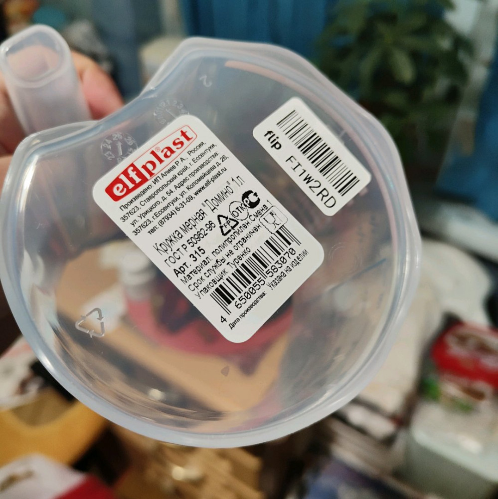 Отличная мерная кружка. Лучшая в своем роде. Пластик тослый, крепкий, белый, но полупрозрачный. Сама кружка легкая, эргономичная, продуманная форма и супер крепкая ручка, смело можно наливать полный литр и не бояться, что отличиться ручка. Весомый плюс - производство Россия, фирма Elfplast, серия кружек "Domino". Ранее купила в MegaArzan этой же серии, но поменьше на 0,5л. Как здесь увидела такую же но на 1л как хотела, не раздумывая заказала. Цена приятная, а качество высокое)) Рекомендую!