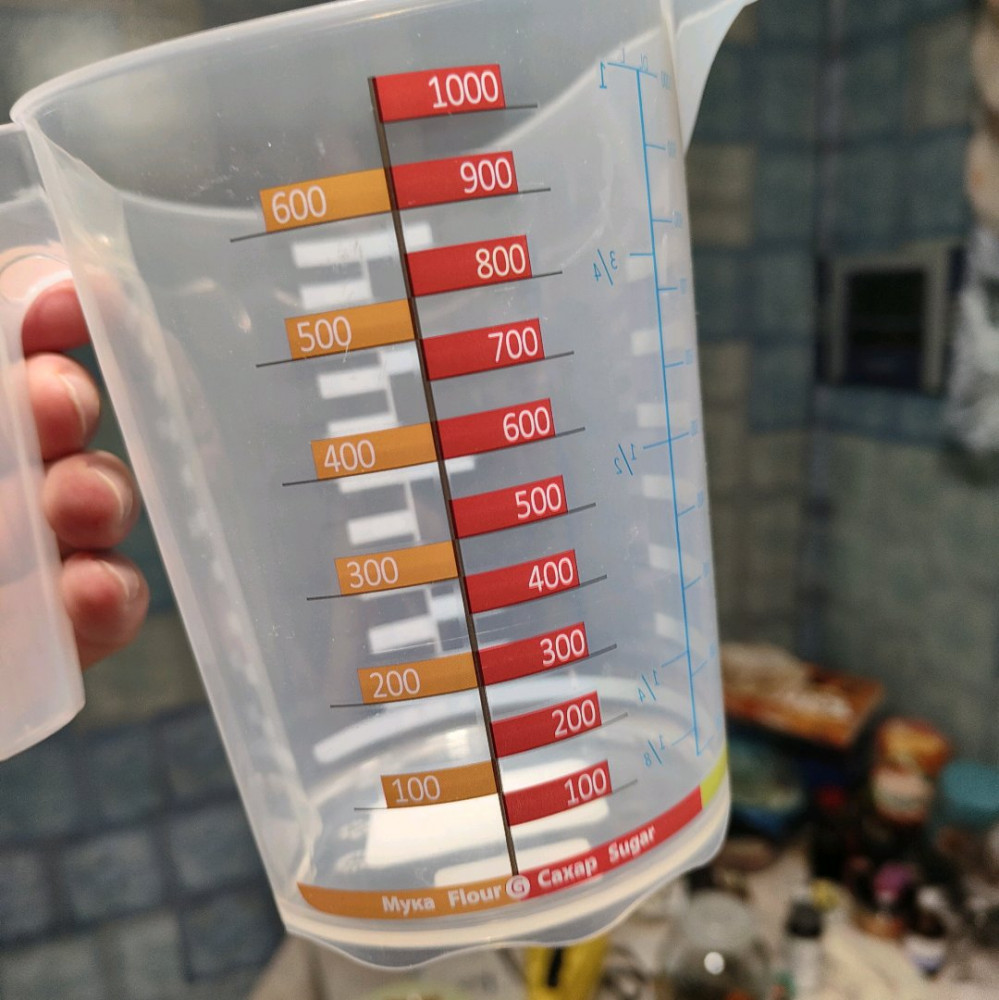 Удобная форма и небольшой размер, устойчивая. До этого была более узкая и повыше, хотя с таким же объемов - это неудобно, так как она падала при любом прикосновении, когда была пустая. Пластик плотный, гладкий, без запаха. Отлично видно все метки. Классно, что они разного цвета для граммов и миллилитров, не нужно напрягаться и вникать. А цена вообще смешная.