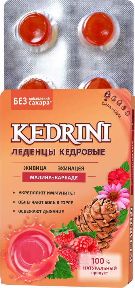 Кедровые леденцы «Kedrini» с малиной и каркаде. В их составе только натуральные ингредиенты: кедровая живица (смола), кедровое масло, экстракты эхинацеи, каркаде, малины и витамин С, изомальт — в качестве натурального сахарозаменителя. Эти леденцы поддержат ваш иммунитет, помогут справиться с першением в горле и освежат дыхание.