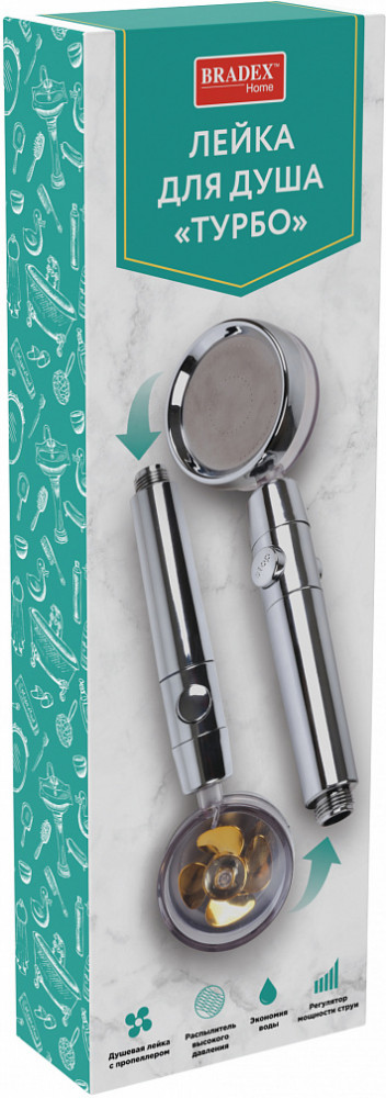 В данный момент этот товар отсутствует в продаже. Возможно, у нас найдется аналогичный или похожий товар здесь. Особенности лейки для душа «Турбо»: встроенный пропеллер для повышения давления и напора воды; подходит для использования при низком напоре воды; водосберегающая модель: обеспечивает экономию воды до 30%; мелкодисперсная струя воды со SPA-эффектом; регулятор мощности струи; кнопка старт/стоп для подачи и отключения воды на ручке; сохраняет заданную температуру воды; высококачественное хромированное покрытие; разборная конструкция для легкой очистки; стандартный размер: подходит ко всем видам смесителей; устанавливается без использования специальных инструментов.