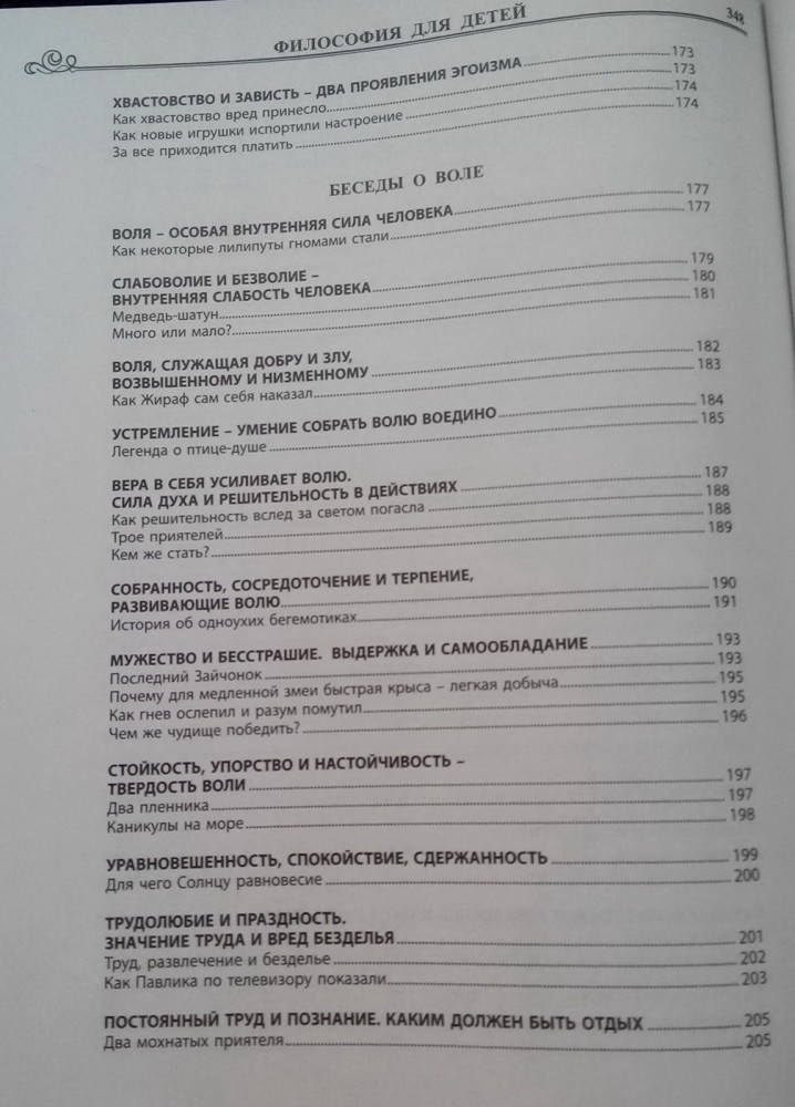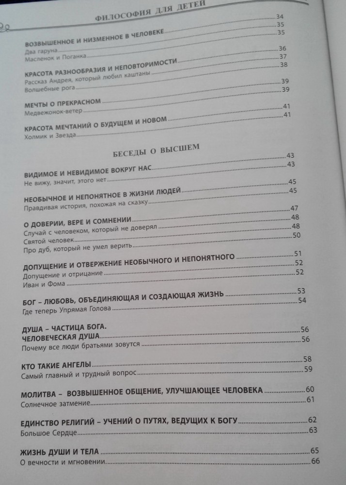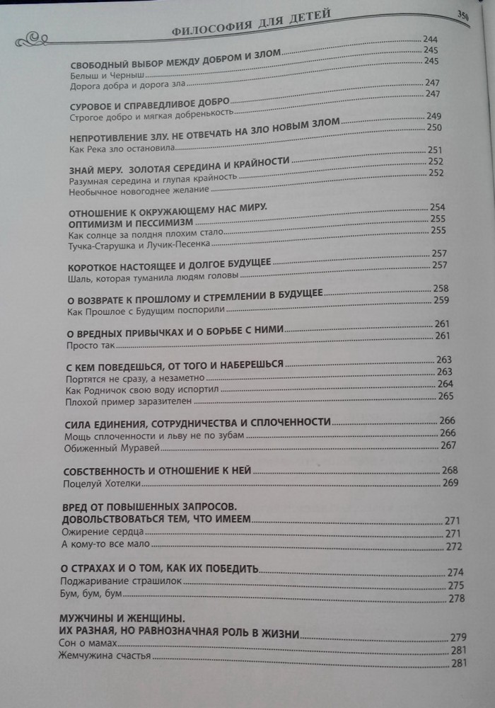 Приобрела две книги: "Философию для детей в сказках и рассказах" М.Андрианова и "Основы философии для детей" Л.Остроумовой. Какая лучше - сказать не могу, понравились обе. Книги однотипные по тематике и структуре. В начале каждой беседы представлен теоретический материал, затем две истории на эту тему. В конце каждой истории - вопросы. Кто у кого "позаимствовал" идею, не знаю. Книги дополняют друг друга. У М.Андрианова теоретический материал предназначен для взрослых, предстален довольно сложным языком, тезисно, мелким шрифтом. Чтобы объяснить тему ребенку, взрослый должен сначала изучить материал и затем в доступной форме перессказать его ребенку. У Л.Остроумовой же всё написано для детей, просто и понятно для детского восприятия. Читать может как взрослый ребенку, так и ребенок самостоятельно. Сказки и истории М.Андрианова и Л.Остроумовой, в основном, не повторяются, хотя есть и несколько (менее 10) одинаковых по содержанию, но изложенных по-разному. Вопросы для обсуждения представлены тоже по-разному. У М.Андрианова на вопросы даны готовые варианты ответов (в скобках), так что взрослому не надо думать над ответом. В книге Л.Остроумовой ответов нет, выводы придется делать вместе с ребенком. Книга М.Андрианова более эзотерична, раздел "Беседы о высшем" совсем не понравился, в то время как книга Л.Остроумовой более близка христианским позициям. Бумага в обоих изданиях серая, газетная. Иллюстраций нет. Книги хоть и большие, но очень легкие, удобные. В текстах встречаются грамматические ошибки. В 2017 году книга М.Андрианова вышла в 12 издании, дополненном, содержит 352 страницы. Издание 2016 года - 288 страниц. Содержание книг: Л.Остроумова Основы философии для детей Введение Методика работы с книгой 1. БЕСЕДЫ О КРАСОТЕ Беседа о красивом и некрасивом Беседа о красоте сердца Беседа о красоте внешней и внутренней Беседа о красоте ложной и настоящей Беседа об умении замечать красоту. Беседа о красоте души Беседа о волшебной силе красоты Беседа о разнообразии Беседа о гармонии Беседа о культуре 2. БЕСЕДЫ О НЕИЗВЕДАННОМ Беседа о мечтах Беседа о непознанном Беседа о душе Беседа о снах Беседа о смерти Беседа о религии 3. БЕСЕДЫ О ВЫСОКИХ ЧУВСТВАХ Беседа о разуме и чувствах Беседа о доверии Беседа о силе Беседа о совести Беседа о любви Беседа о человечности Беседа о великодушии Беседа о законе справедливости Беседа о дружбе Беседа о доброжелательности Беседа о милосердии Беседа о снисхождении Беседа о прощении 4. БЕСЕДЫ О НЕДОСТОЙНОМ Беседа об эгоизме Беседа об упрямстве Беседа о злорадстве Беседа о зависти Беседа о лени Беседа о сквернословии Беседа об осуждении и нетерпимости.. Беседа о ненависти и мести Беседа о жестокости Беседа о лжи и лицемерии Беседа о высокомерии и честолюбии... 5. БЕСЕДЫ О ДОБРОДЕТЕЛЯХ Беседа об ответственности Беседа о чуткости и отзывчивости... Беседа о вежливости Беседа о честности Беседа о верности Беседа о щедрости Беседа о справедливости Беседа о терпении 6. БЕСЕДЫ О ВОЛЕ Беседа о силе воли Беседа о целеустремленности Беседа о решительности Беседа о мужестве Беседа о самообладании Беседа о настойчивости Беседа о трудолюбии 7. БЕСЕДЫ О СИЛЕ МЫСЛИ Беседа о мышлении Беседа о привычках Беседа о воображении и фантазии Беседа о страхах Беседа о памяти и запоминаниях Беседа об оптимизме, пессимизме и реализме Беседа об иллюзиях М.