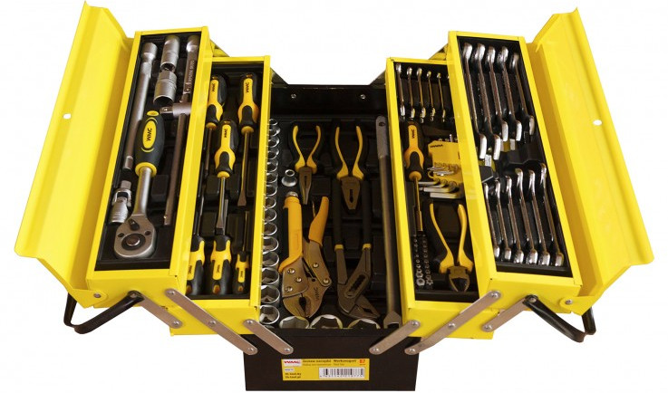 Набор инструмента WMC Tools представляет собой комплект профессионального оборудования для работы слесаря, автомеханика, электрика и других специалистов. Все элементы набора выполнены из прочной стали, которая обладает высокой устойчивостью к физическому износу и нагрузке, что позволяет увеличить срок службы. Для работы с крепежом различного формата имеются отвертки и комплект коротких бит под отверточную рукоятку. Наличие большого количества разнообразного инструмента значительно расширяет сферу применения комплекта. Его также можно использовать при проведении ремонта. Для простоты транспортировки комплект уложен в железный кейс с надежным защелками, что позволяет переносить инструмент с минимальным шумом.