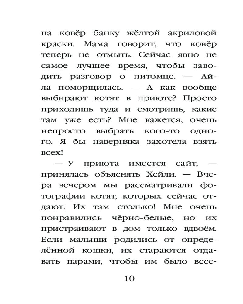 Серия: Детск. Холли Вебб. Добрые истории о зверятах. Мировой бестселлер Айла мечтает о котёнке и с радостью соглашается присмотреть за двумя соседскими котиками. Вдруг родители поймут, какая она ответственная и согласятся завести питомца? Но похоже, что из этой затеи ничего не выйдет. Как только Айла пришла покормить котиков, они сначала чуть не подрались, а потом разбежались. И что Айле делать? Как помочь котикам подружиться? |