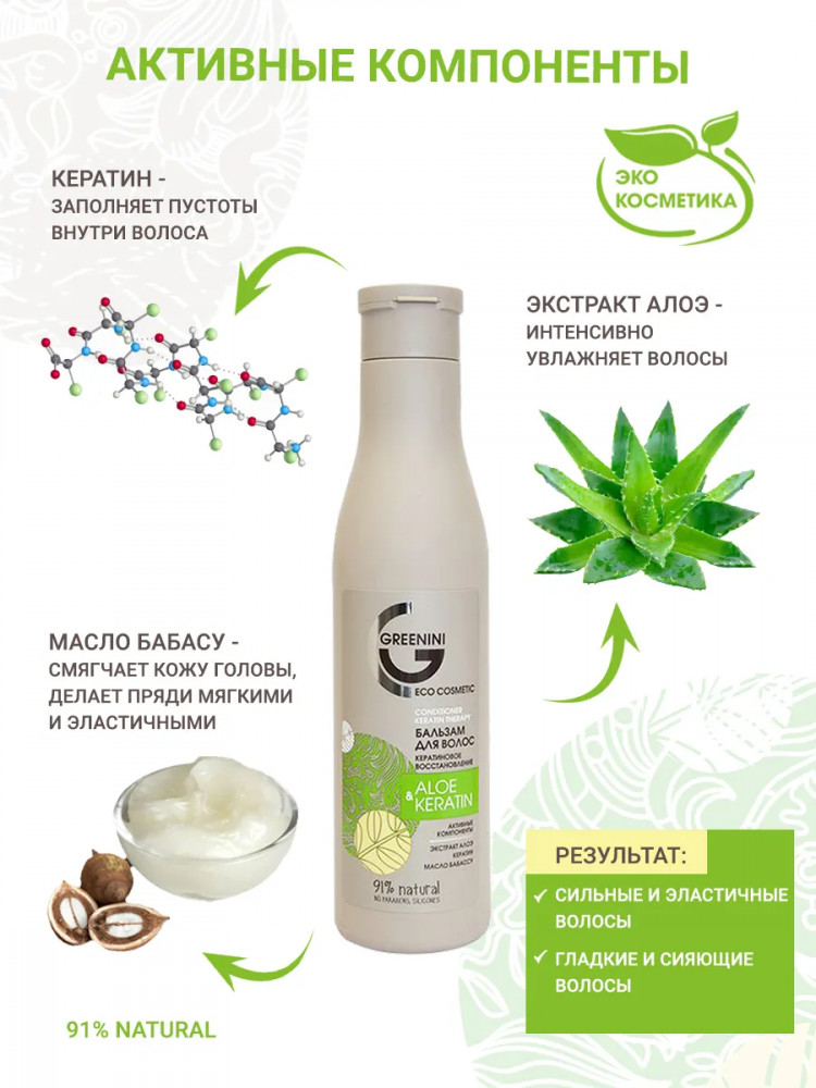 Greenini Бальзам для волос кератиновое восстановление «Aloe & keratin»