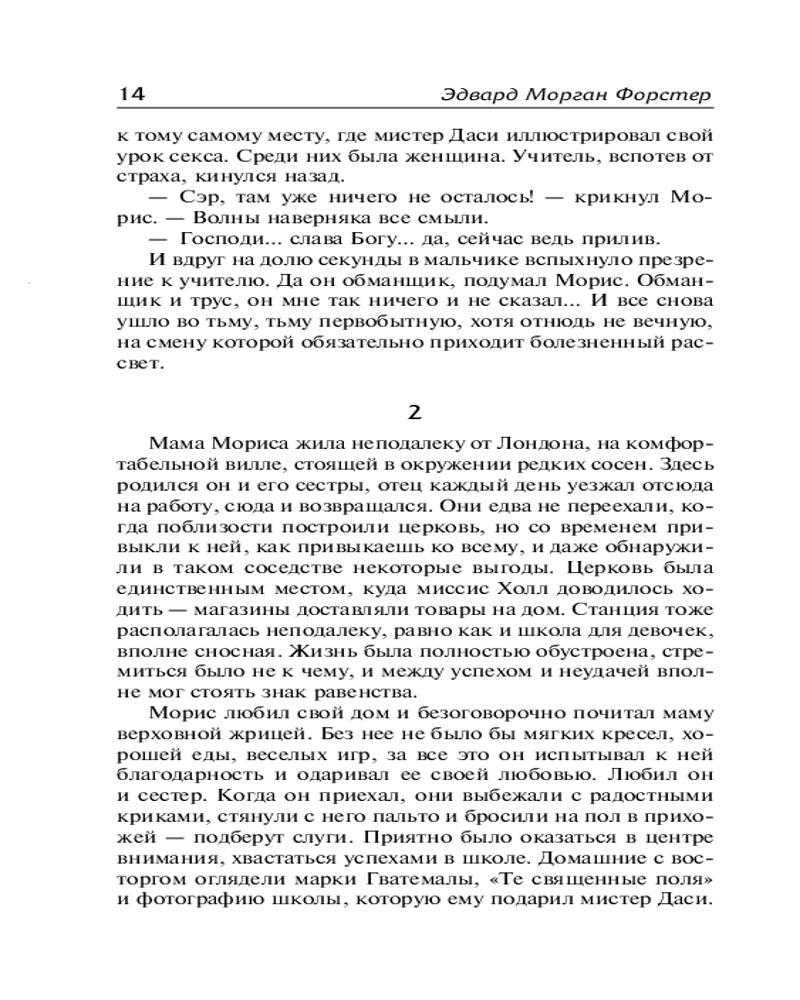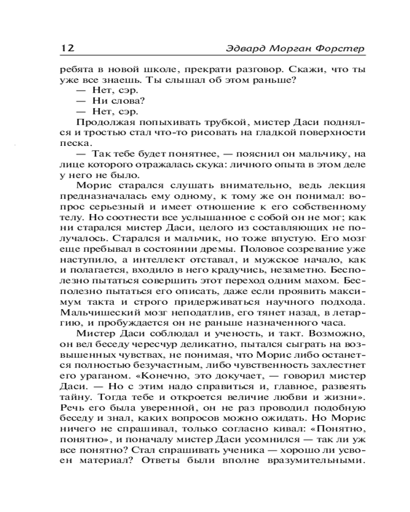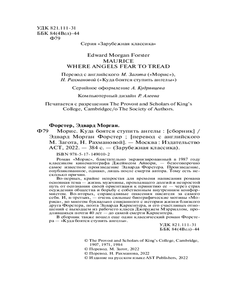 Морис. Куда боятся ступить ангелыВ данный момент этот товар отсутствует в продаже. Возможно, у нас найдется аналогичный или похожий товар здесь. Серия: Зарубежная классика Роман «Морис», блистательно экранизированный в 1987 году классиком кинематографа Джеймсом Айвори, — безоговорочно самое известное произведение Эдварда Форстера. Произведение, опубликованное, однако, лишь после смерти автора. Тому есть несколько причин. Во-первых, крайне непростая для времени написания романа основная тема — жизнь мужчины, проходящего долгий и непростой путь от осознания своей ориентации к принятию ее — через страх осуждения общества и борьбу с собственным внутренним конформистом. Во-вторых, справедливые опасения писателя за самого себя. И, в-третьих, — очень сильные биографические мотивы «Мориса», во многом буквально списанного с истории жизни близкого друга Форстера, поэта Эдварда Карпентера, и его счастливых отношений с выходцем из рабочего класса Джорджем Мэрриллом, продлившихся почти 40 лет — до самой смерти Карпентера. В сборник также вошел еще один классический роман Форстера — «Куда боятся ступить ангелы». |