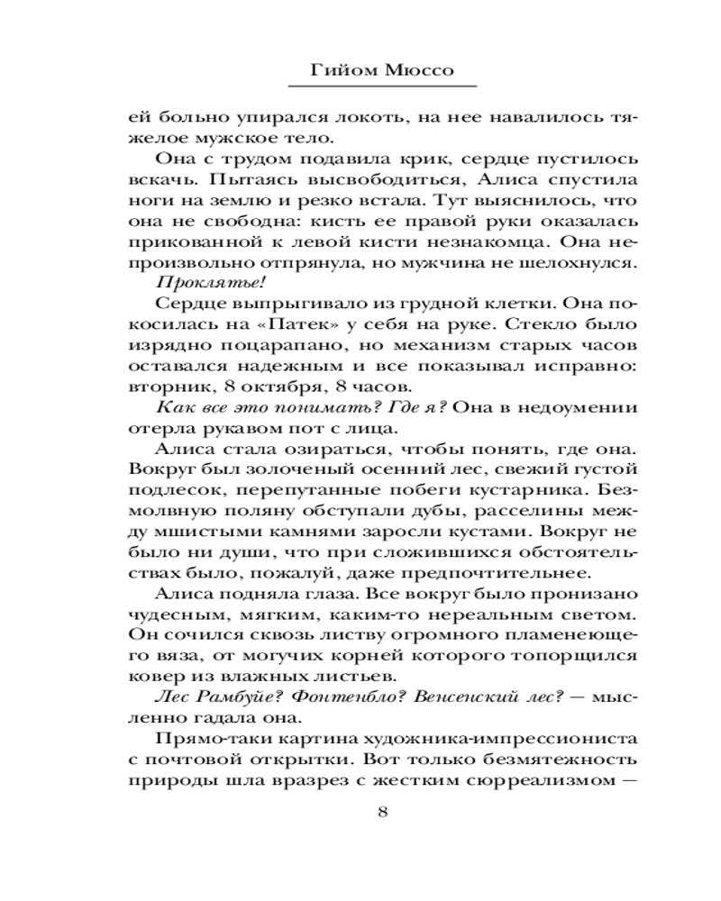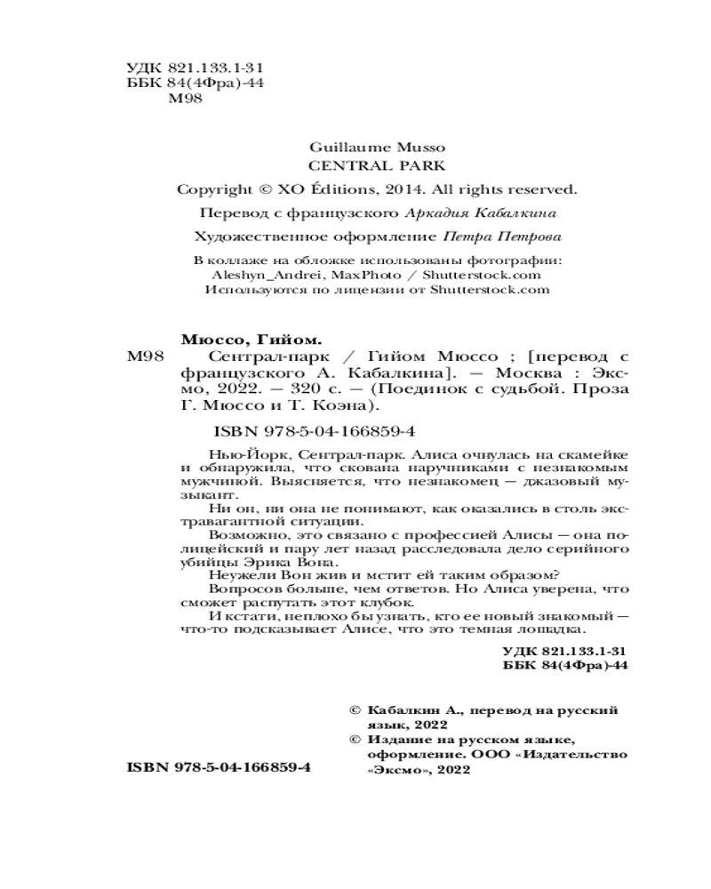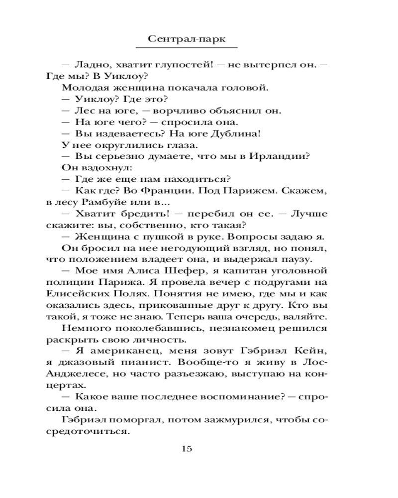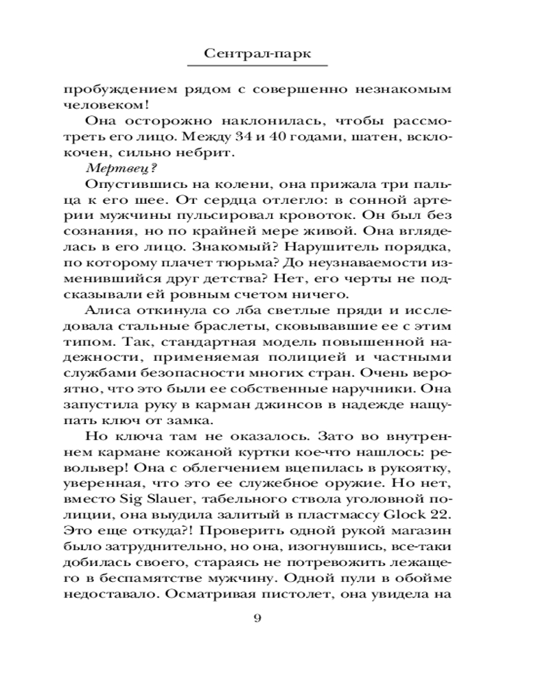 В романе «Сентрал-парк» Гийом Мюссо остается верен своему фирменному авторскому стилю — стремительное развитие событий, нарастающее напряжение, постоянно открывающиеся шокирующие подробности. Нельзя с уверенностью сказать, чем все закончится, пока не перевернута последняя страница его романа. Впрочем, когда просыпаешься в Центральном парке прикованной к незнакомцу, а на твоей одежде — следы крови, разгадка не может быть легкой...
