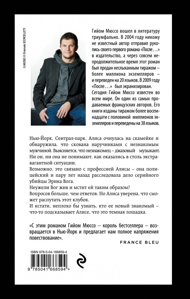 В данный момент этот товар отсутствует в продаже. Возможно, у нас найдется аналогичный или похожий товар здесь. Серия: Поединок с судьбой Проза Г. Мюссо и Т. Коэна Гийом Мюссо родился во Франции. В 19 лет провел несколько месяцев в Нью-Йорке и Нью-Джерси. Первая книга, вышедшая во Франции, была продана тиражом 2 миллиона экземпляров и переведена на 20 языков. Сегодня тираж книг Гийома Мюссо свыше 33 миллионов экземпляров, и они переведены на 42 языка.