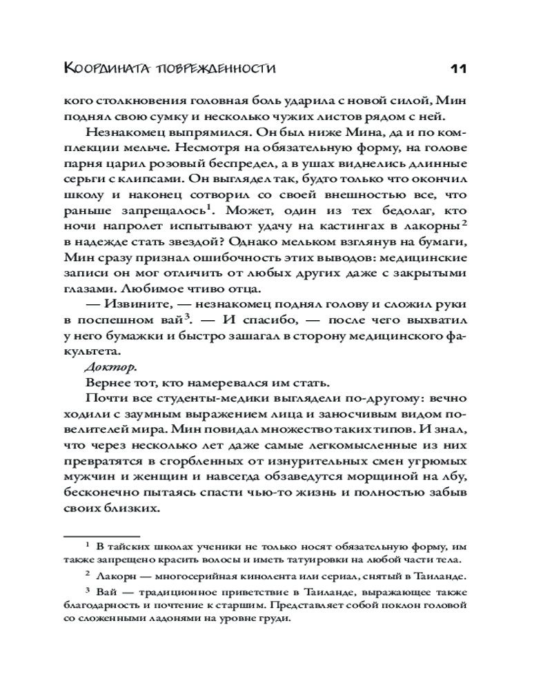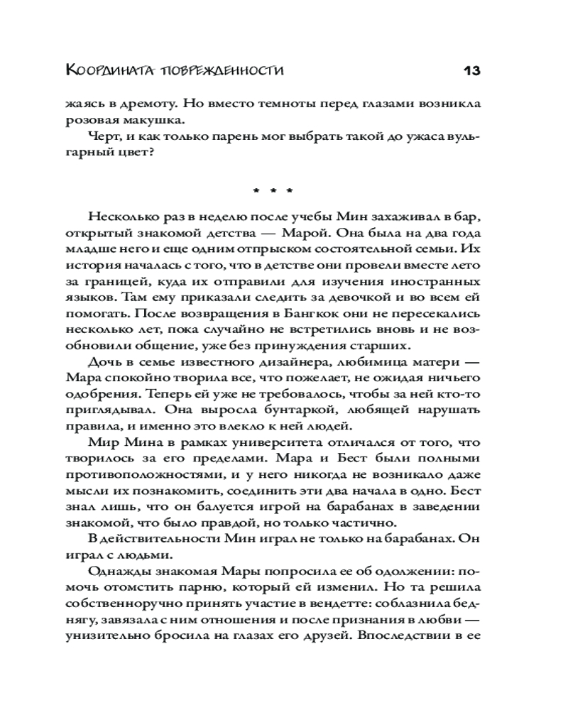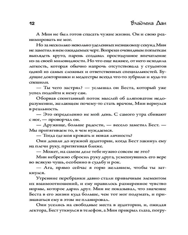 Координата ПоврежденностиВ данный момент этот товар отсутствует в продаже. Возможно, у нас найдется аналогичный или похожий товар здесь. Серия: Звезды молодежной прозы на русском Мин — сын известного врача, основателя крупнейшей сети больниц Таиланда. Он стоит на пороге взрослой жизни, оканчивает университет, но не желает наследовать бизнес отца, пусть и настоящей гордости Бангкока. Тем более когда его жизнь разрушилась в прошлом. У Мина нет цели, и тот, кем он должен стать, душит его изнутри. Он застыл, не находя в себе сил повзрослеть, пока этого ожидают его успешный отец, закон природы и течение времени. Однажды в его дом подселяют того, кем Мин не стал, — идеального студента-медика с мечтой и целями. Тот, кто выбрал одиночество, и тот, кого туда бросили, столкнутся. Кто победит в этом противостоянии? Или, может, каждый из них на самом деле все это время сражался с самим собой? |